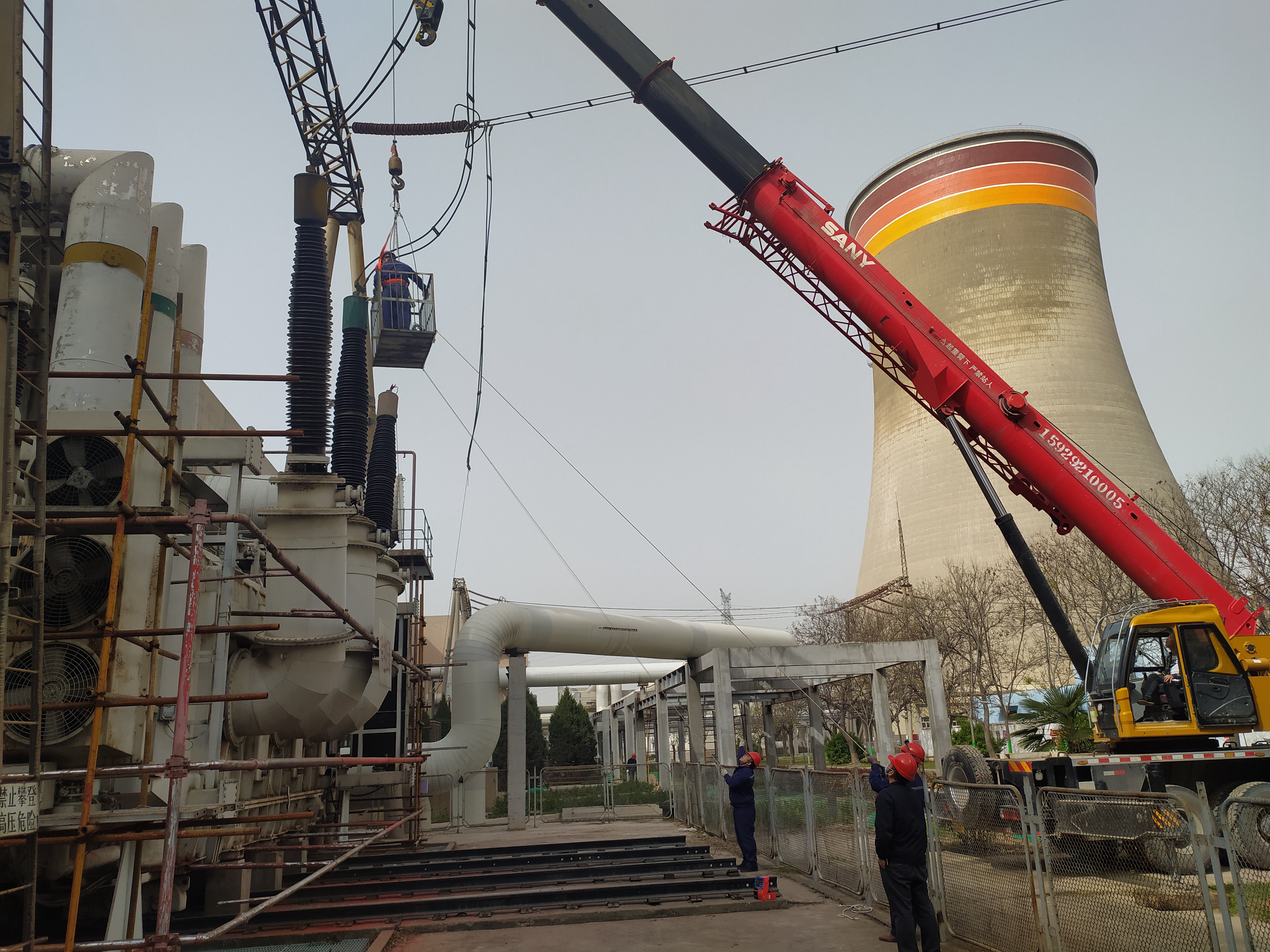 3月30日,汽机房外,花红柳绿、春意盎然。#5主变处,吊车高高耸立,操作平台上,工作人员或清理阀门、或处理渗油,主变小修工作正有条不紊地进行。