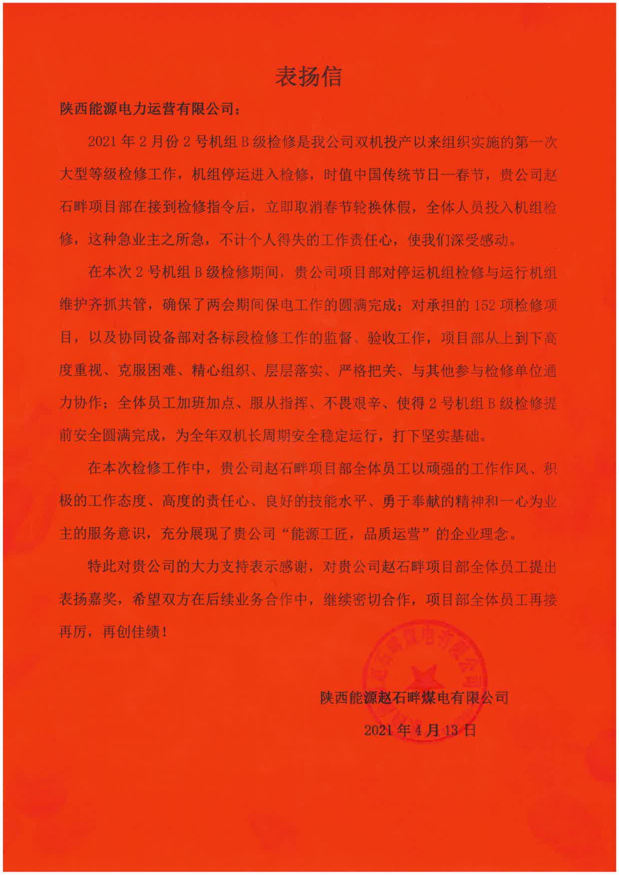 4月14日,公司收到陕西能源赵石畔煤电有限公司的表扬信,对赵石畔项目部在2月份双机投产后的第一次大型等级检修和“两会”保电工作中的付出表示高度赞扬。