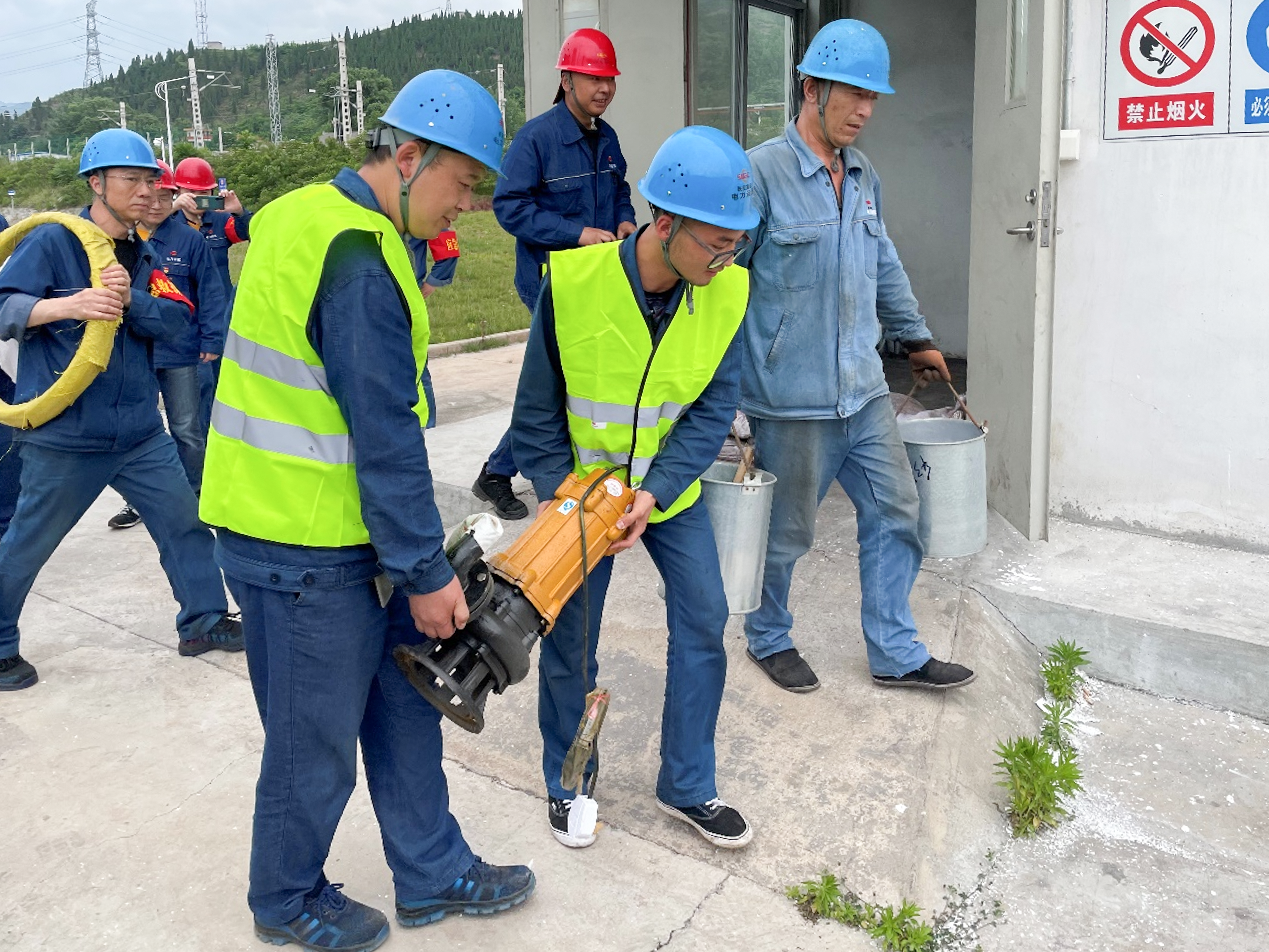 此次演练模拟天气突降暴雨,雨水漫过路沿,自大门灌入输煤#1转运站,造成#1转运站进水的紧急事故。演习开始后,各防汛责任小组迅速反应,按指挥到达指定地点实施防汛抢险。机务救援组迅速组织人员堆放沙袋,架设潜水泵;电气救援组立即准备电源箱、电源盘等器材,进行潜水泵电源接线等工作;物资转运组组织人员搬运潜水泵、水带、沙袋等应急救援物资。整个演练过程紧张有序,各环节衔接流畅,圆满完成应急演练任务。