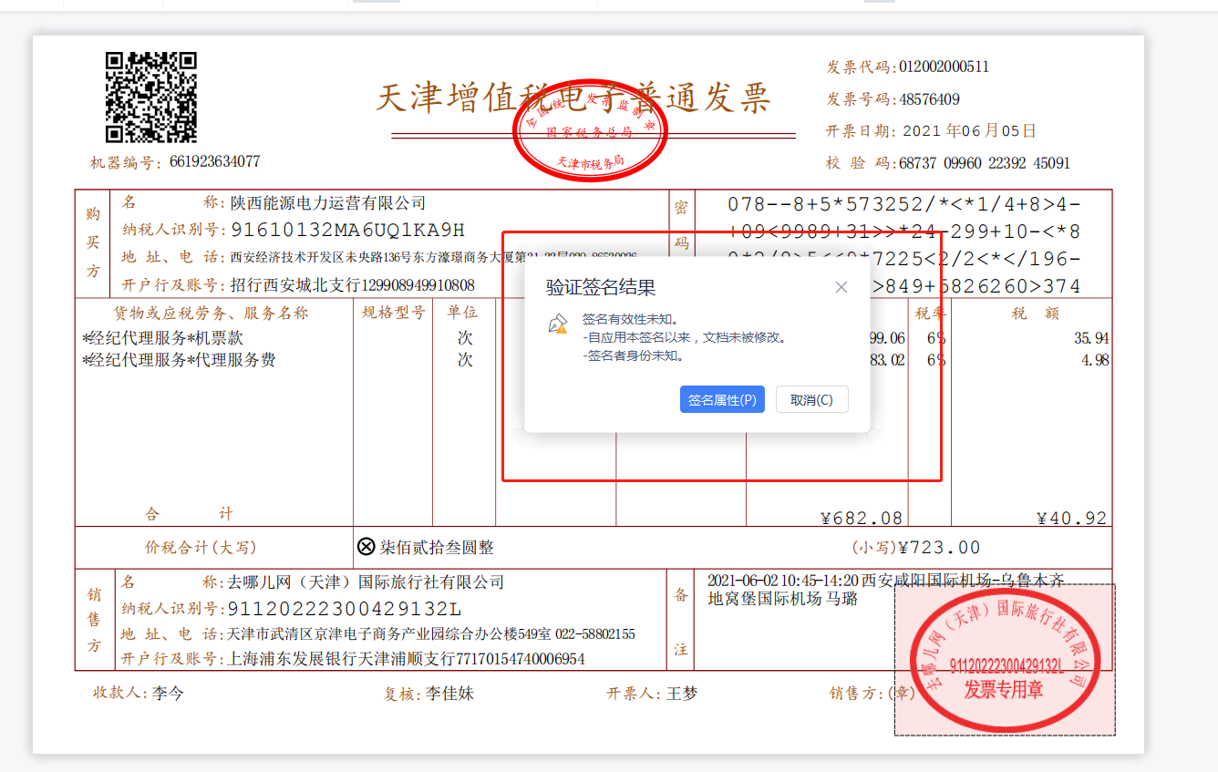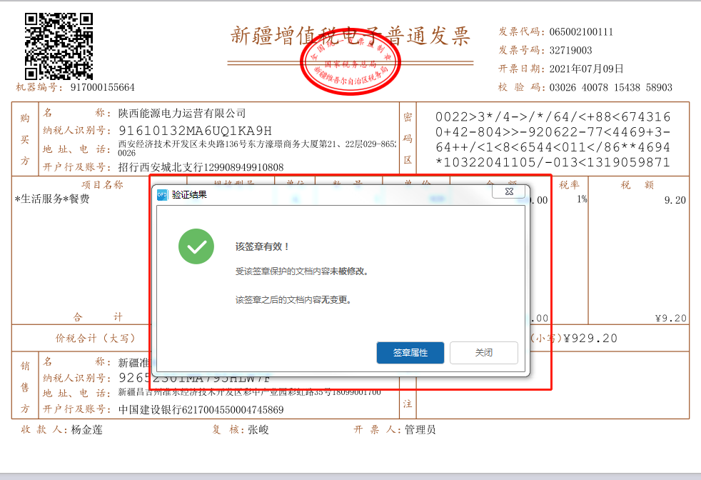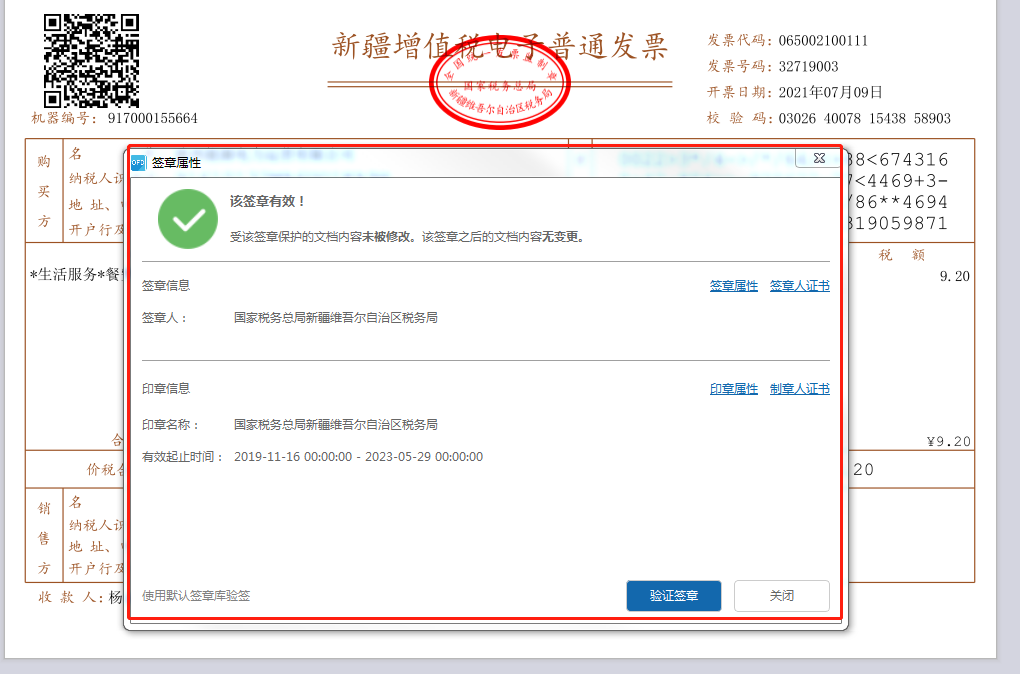 第三步,点击“验证”后,弹出验证结果提示框,如下图所示,若签章有效且发票信息未被篡改,则验证结果显示为“该签章有效!自应用本签章以来,文档内容未被修改”,并且点击“签章属性”,属性中显示的签章信息应与票面签章一致。