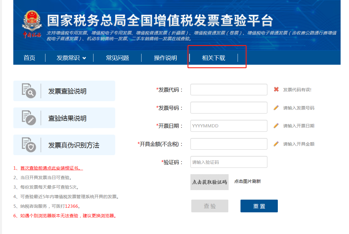 特别提示:单位和个人通过网页浏览器首次登陆平台时,应根据提示下载安装根证书文件,并仔细查看查验平台提供的发票查验操作说明。