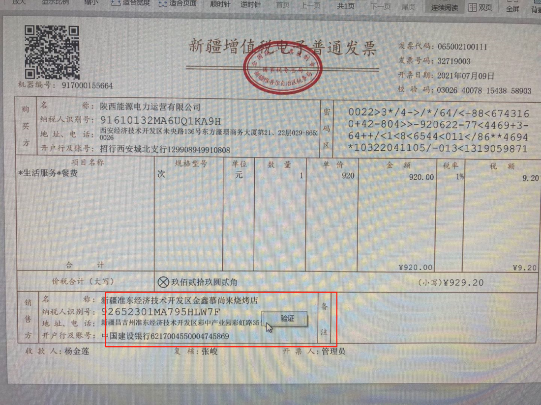 第二步,在阅读器里进行“打开”操作,选择已经下载好的增值税电子普通发票版式文件;也可以直接鼠标双击已下载好的增值税电子普通发票版式文件打开。将鼠标移至增值税电子普通发票“发票监制章”区域内,点击鼠标右键,选择“验证”功能,如下图所示。