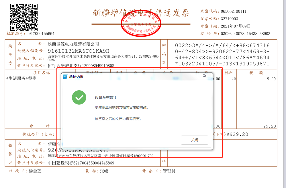 如果销方签名有效,显示验证结果为“该签章有效!自应用本签章以来,文档内容未被修改”。