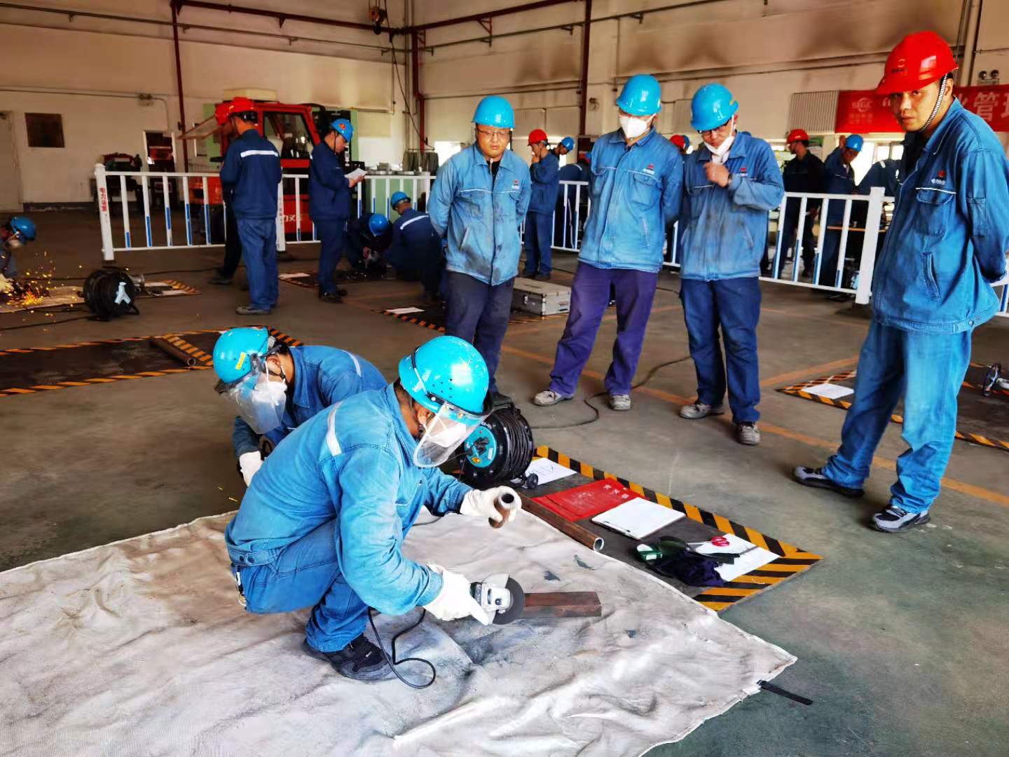 裁判员一声“开始”,各小组迅速进入预定的比赛区域,两人一组,配合默契。机务组参赛选手争分夺秒地采用角磨机按预给尺寸进行坡口制作、管口打磨。转子找中心过程中,队员们沉稳从容,熟练地架表、测量、记录,无论是实验操作还是综合计算,每个人都精益求精,奋勇争先。仪电组参赛选手也不甘示弱,有条不絮地进行着电气盘柜布线、电烙铁焊接及电动机布线,每一步都态度认真、操作规范。经过激烈角逐,机务组气化水班、仪电组电气1班分别荣获技能竞赛第一名。