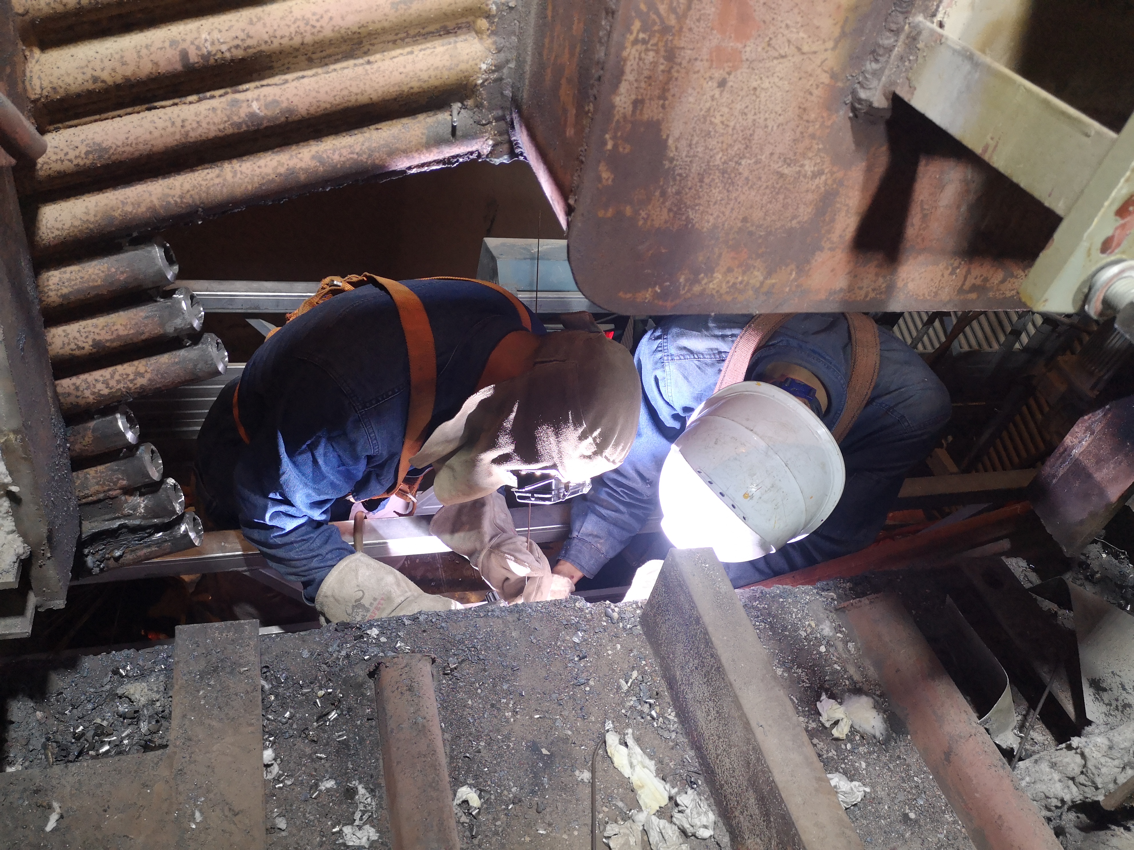各项安全措施落实到位后,抢修人员随即进入炉膛,采用两班倒、各专业多路分兵作战的方式展开工作。密闭的炉膛内,迎着铺面而来的粉尘,锅炉班人员一丝不苟查找漏点、测厚、确定更换水冷壁的位置及长度;冒着高温,各专业人员相互配合,割除、制口、下料各项工作有条不紊地进行着。