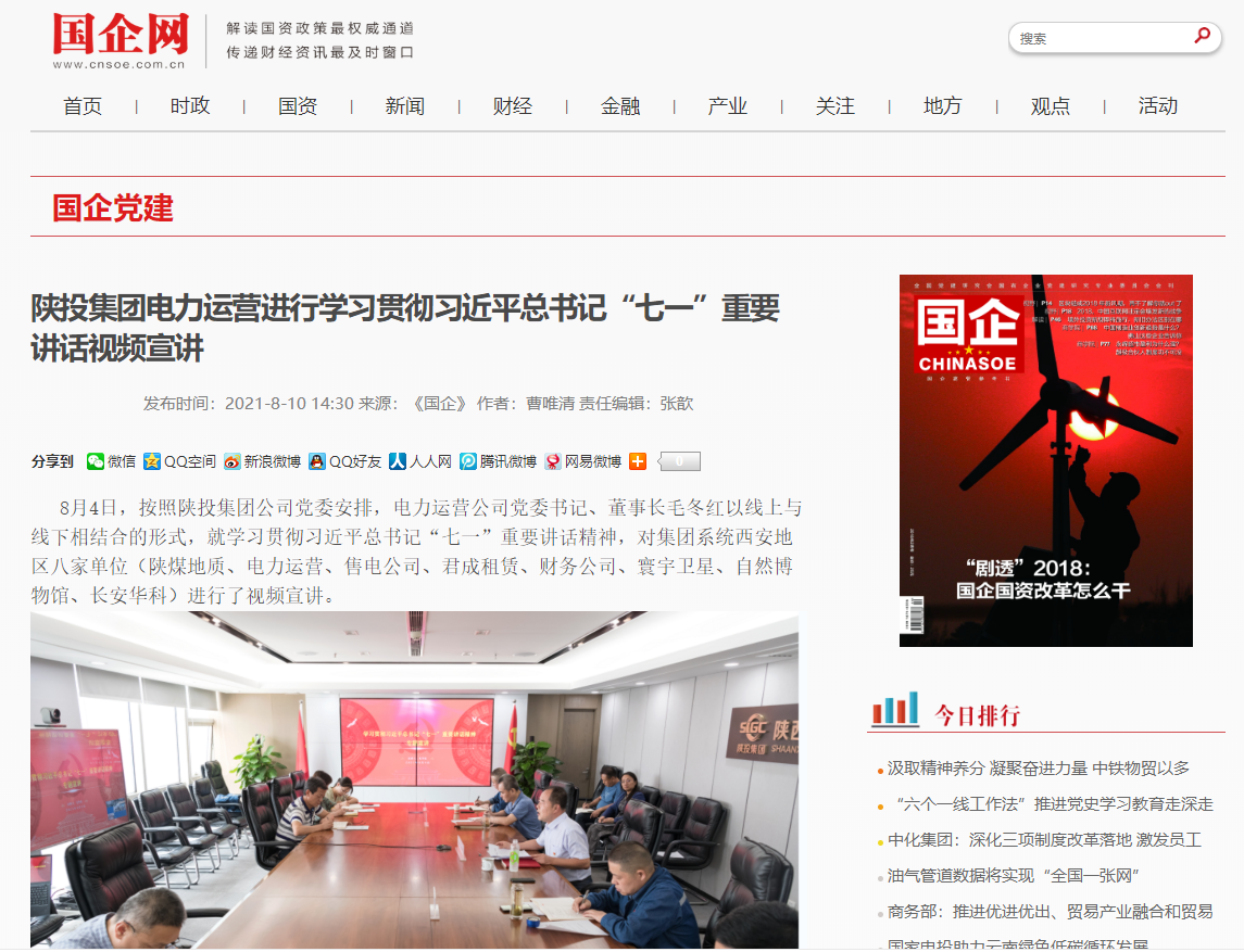 8月4日,按照陕投集团公司党委安排,电力运营公司党委书记、董事长毛冬红以线上与线下相结合的形式,就学习贯彻习近平总书记“七一”重要讲话精神,对集团系统西安地区八家单位(陕煤地质、电力运营、售电公司、君成租赁、财务公司、寰宇卫星、自然博物馆、长安华科)进行了视频宣讲。