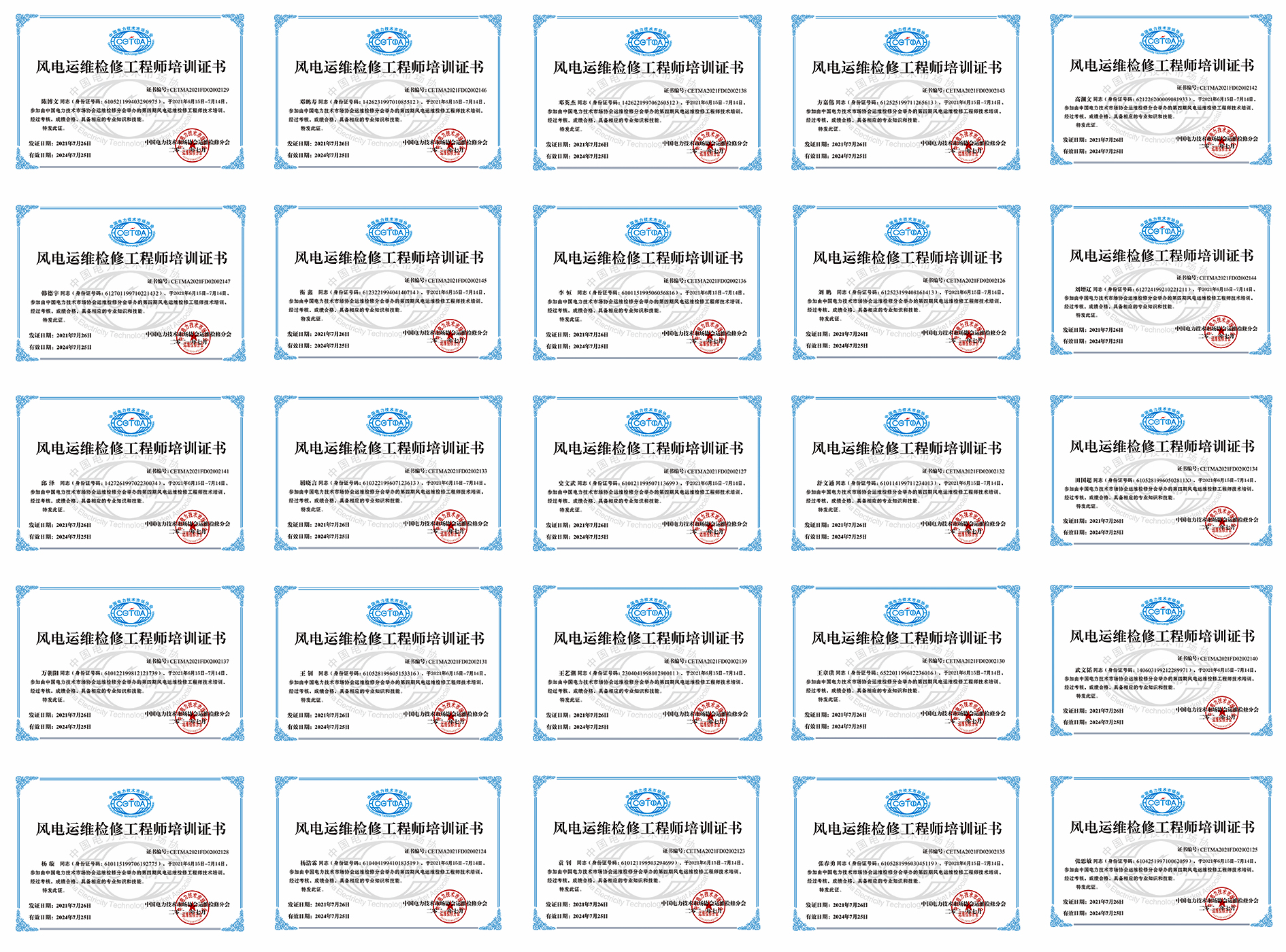 近日,公司参加了中国电力技术市场协会运维检修分会举办的第四期风电运维检修工程师技术培训班,25名学员顺利通过考试并全部取得《风电运维检修工程师培训证书》。