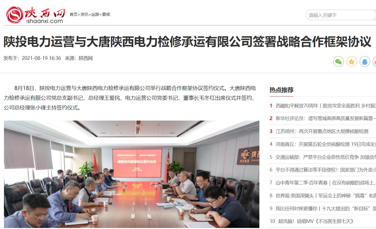8月18日,公司与大唐陕西电力检修承运有限公司举行战略合作框架协议签约仪式。大唐陕西电力检修承运有限公司党总支副书记、总经理王爱民,电力运营公司党委书记、董事长毛冬红出席仪式并签约,公司总经理张小锋主持签约仪式。