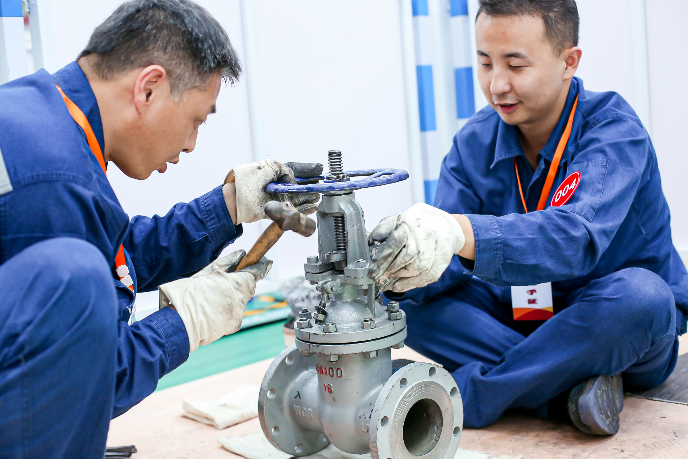 开幕式后的阀门检修实操比赛中,选手拿出看家本领,从工器具摆放、检修报告的记录、阀门的解体到零部件的清理回装有序进行,对阀芯阀座密封面的研磨更是细致谨慎,并运用元宝铁、百分表测量阀杆弯曲度,细致调整盘根填料的紧固程度,整个过程紧张有序、忙而不乱,展现出良好的基本功和技术水平。