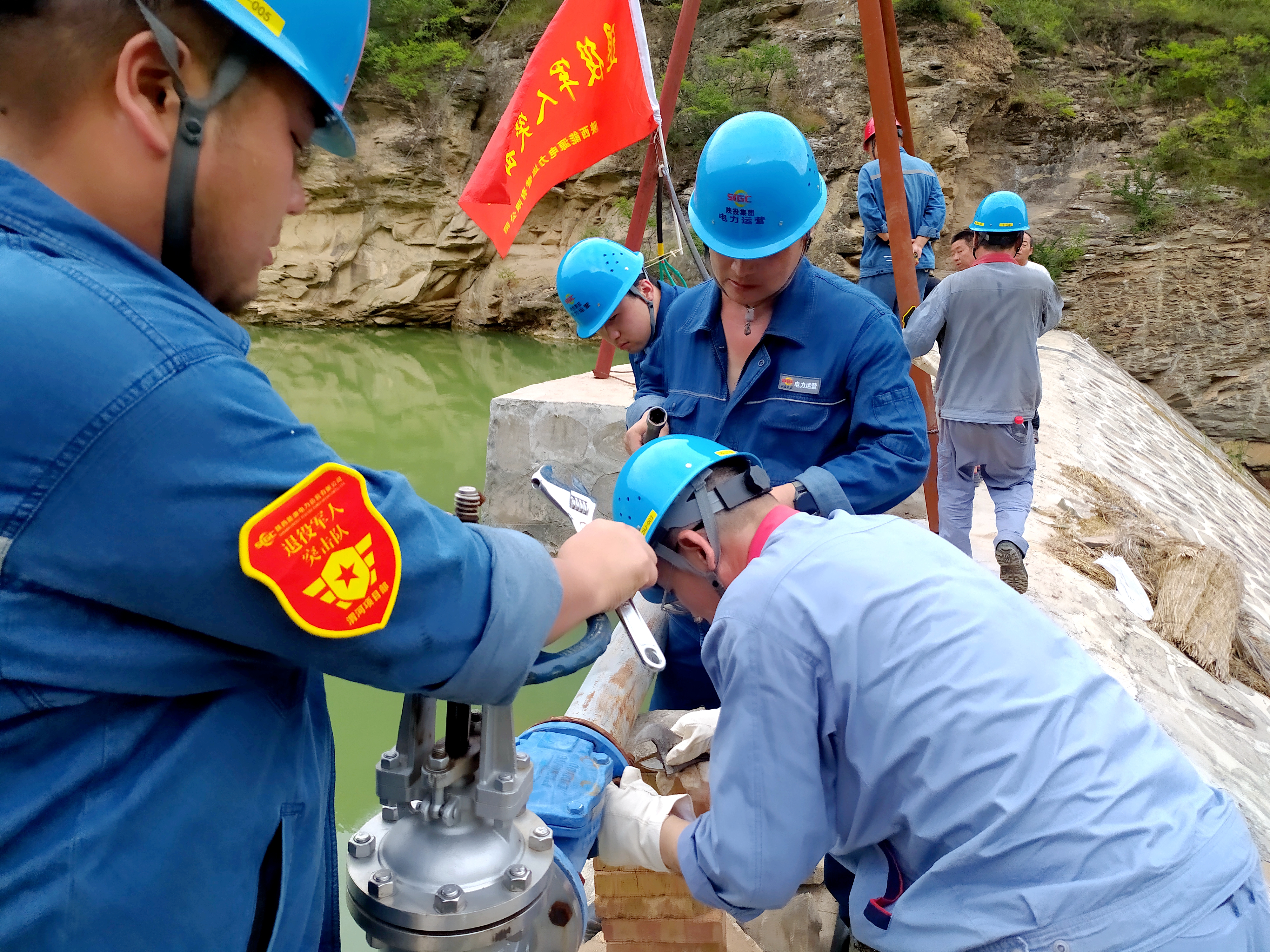 到了沟底,查设备,巡线路,找问题,队员们马不停蹄投入抢修工作。头顶着火辣辣的太阳,眼前虽是一汪碧水,可沟里一丝风也没有,温度超过40℃。人站在河坝上即使不干活,一会儿就汗流浃背,头晕目眩。工作中,大家不时抹一把脸上、身上的汗,开玩笑说:“鱼在下面的河水里游泳,我们在岸上的汗水里游泳。”可为了打通这条关乎全村的“生命线”,大家临深渊,没有一个人临阵退缩;涉险滩,始终没有一句怨言。