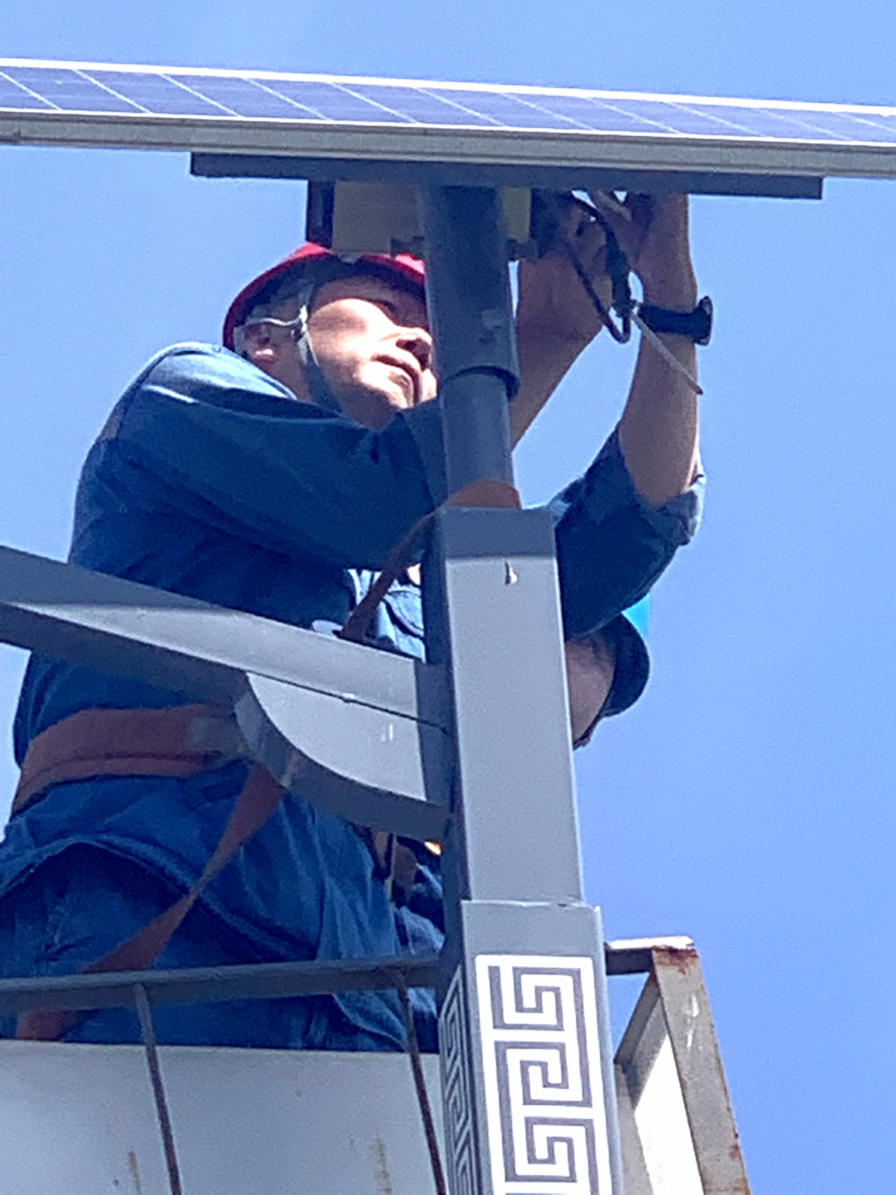 赤日炎炎下,路灯维修小队的队员们在做好安全措施后,冒着太阳的炙烤,蚊虫的叮咬,爬上一根根8米高的电杆,对70盏路灯逐一进行检查。队员们对故障路灯进行了测试,排查出了太阳能板、控制器损坏等问题,对线路老化、损坏的灯头进行维护更换,对太阳能板损坏、控制器烧毁的队员们进行了详细统计,列出了采购清单,以便下次集中进行更换处理。