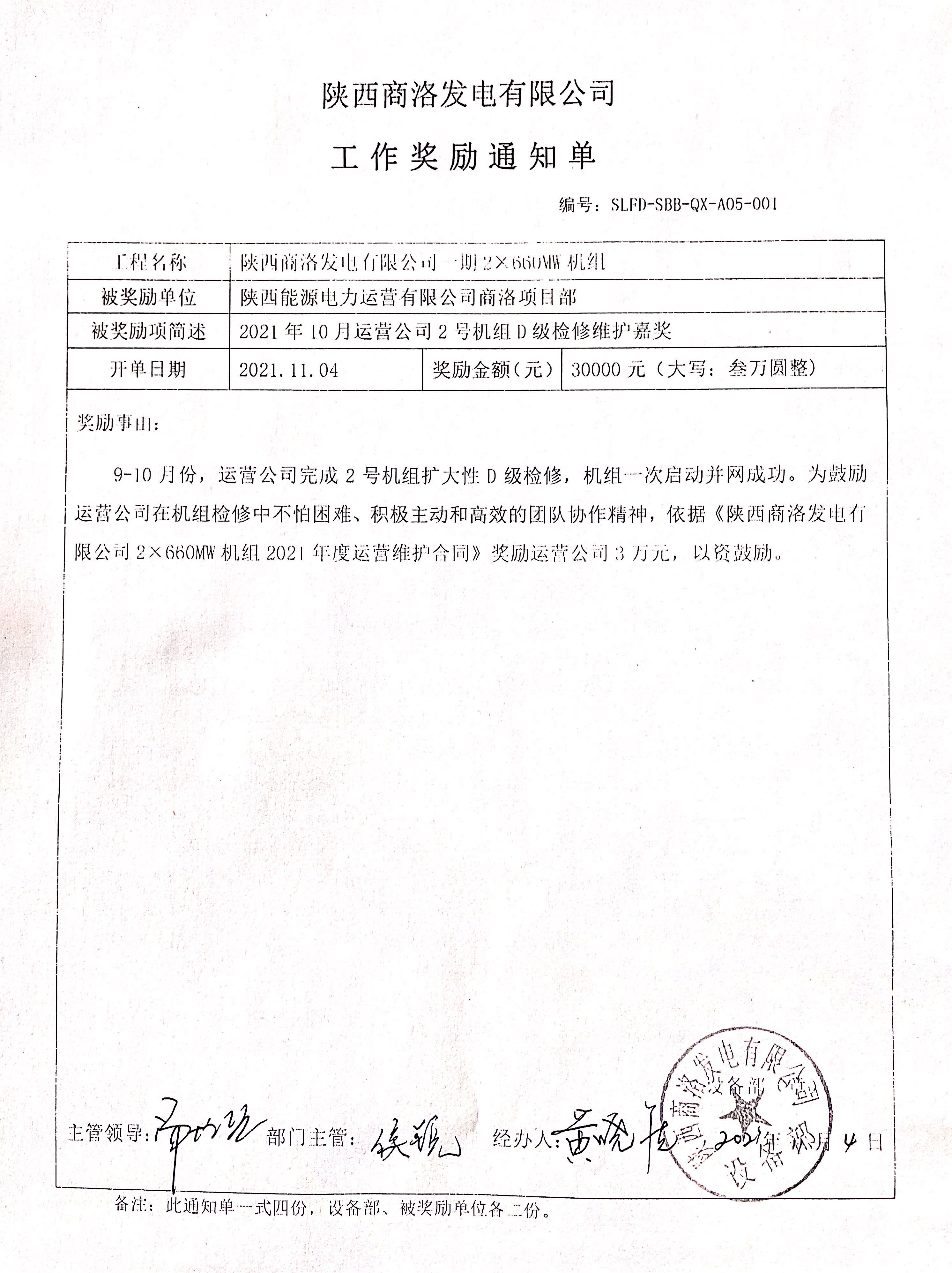 近日,商洛项目部收到来自商洛发电公司的奖励单通知单,奖励金额共计30000元,展现了业主方对项目部在此次#2机组扩大性D修中不畏艰难、勇于担当的“运营铁军”的充分肯定。