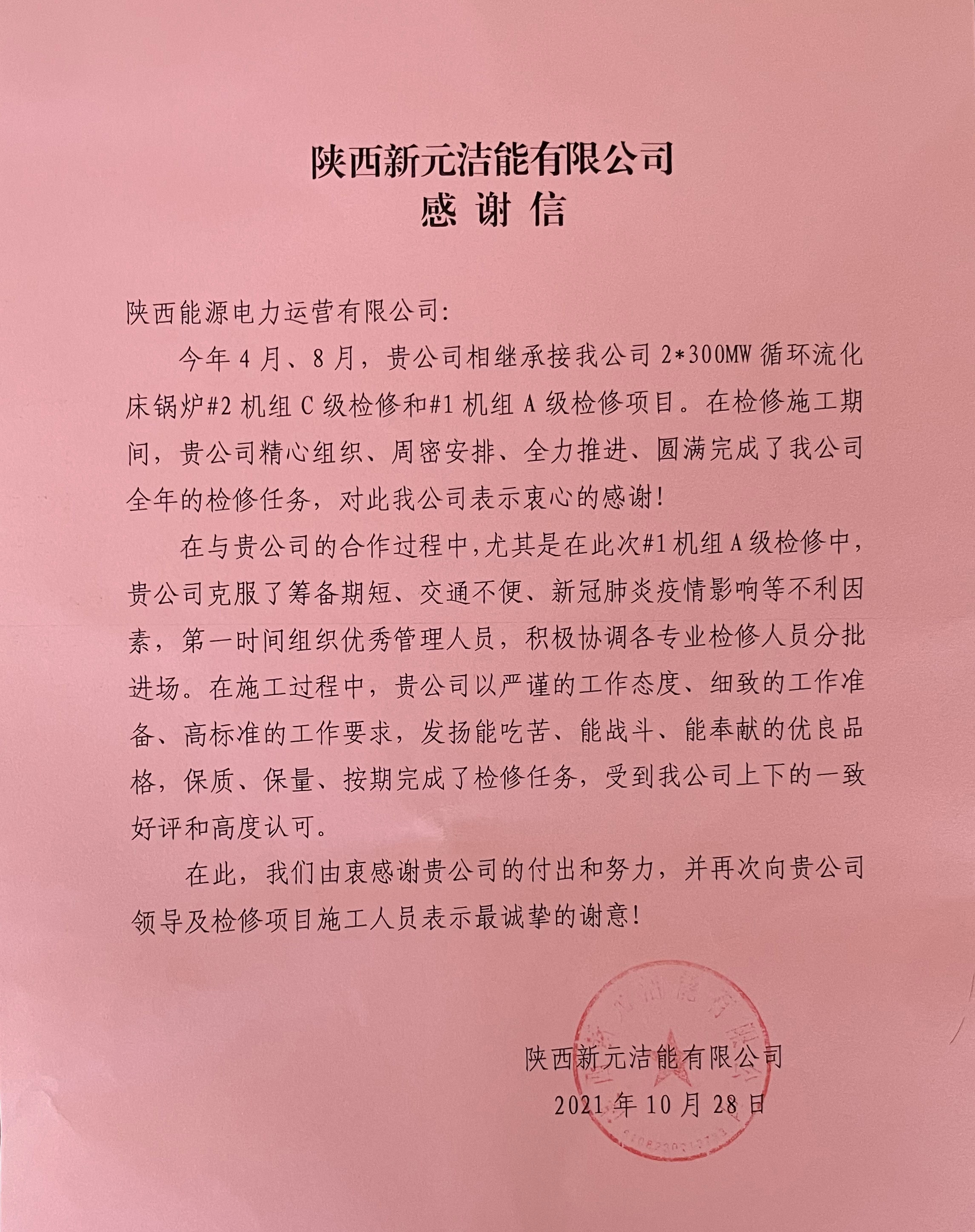近日,公司收到陕煤集团陕西新元洁能有限公司的感谢信,对在圆满完成#2机组C级检修和#1机组A级检修项目中展现出的专业水准和顽强作风表示充分肯定,标志着公司拓展集团外等级检修业务取得长足进展。