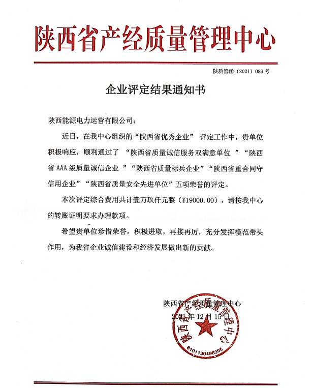 近日,经陕西省产经质量管理中心评定,公司荣获“陕西省质量标兵企业”“陕西省AAA级质量诚信企业”“陕西省质量安全先进单位”“陕西省质量诚信服务双满意单位”“陕西省重合同守信用企业”等五项荣誉称号。