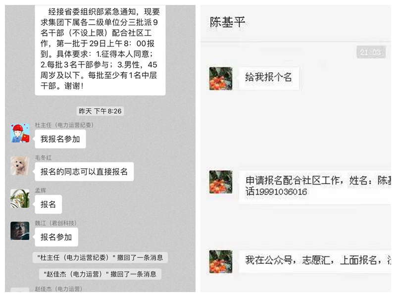 12月28日晚上,“接集团组织部紧急通知,需要抽调9名干部下沉社区配合防疫工作,请大家自愿报名。”看到工作群里的信息,机关党支部书记杜炜率先报名,他说:“在家呆了这几天,心里一直很着急,这下能为疫情防控工作出一份力还真有点激动。”