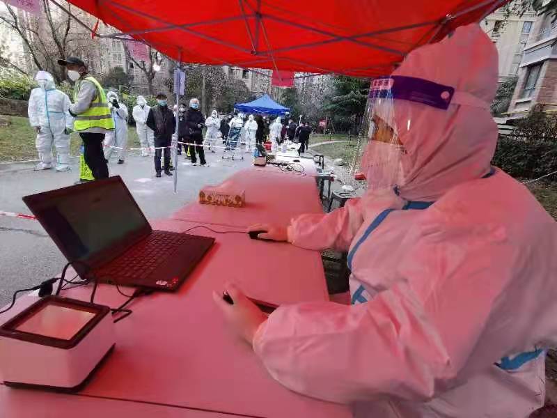 在绿地世纪城小区的核酸采样工作中,赵佳杰从早上8点一直工作到晚上8点。太阳落下,他冻得有些发抖,但还是坚持协助完成了小区800多人的采样工作。他说,疫情使人们变得更加团结,小区业主都非常配合,其实是我们每个人都在用实际行动为社区筑起一道坚固的屏障。