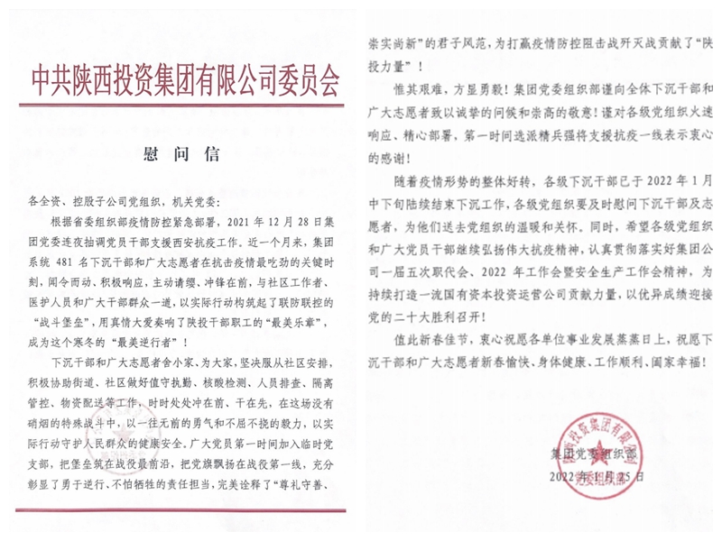 近日,公司收到了集团党委组织部发来的慰问信,对集团系统下沉干部和志愿者在抗击疫情最吃劲的关键时刻,闻令而动、冲锋在前,与社区工作者、医护人员和广大干部群众一道筑起联防联控“战斗堡垒”的精神表示高度赞扬,对各级党组织火速响应、精心部署,第一时间选派精兵强将支援抗疫一线表示感谢。