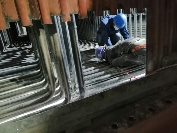为保证主线工作尤其是受热面泄漏抢修工作按期保质完成,项目部周密部署、精心组织,紧扣时间节点分解细化任务,根据炉膛泄漏部位特点制定详细的抢修技术措施和安全措施,并要求锅炉专业将人员进行合理分配,做好交接班记录,保证抢修工作不因交接班出现纰漏。项目部负责人钻进炉膛,实地查看泄漏部位、泄漏面积,详细统计泄漏管子数量及材质。