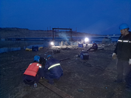 正值#2机组检修时期,面对人员紧张、任务繁重等困难,项目部合理调配人员,现场搭建临时帐篷,全程监控浮桥变化情况,焊接临时浮箱及龙门架,起吊3号浮箱及相关取水管线及廊桥,抢修工作安全有序开展。