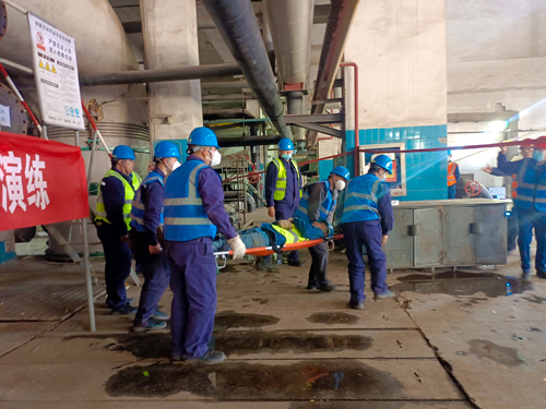 演练模拟一名员工在距离地面0.5米高的水平管道清扫#6机凝汽器内铜管口异物时,因管道湿滑导致腿部摔伤不能移动。事故发生后,现场人员立即组织自救,并及时向应急总指挥报告。根据事故现场情况,演练总指挥迅速集结应急救援小组成员,启动有限空间应急预案。抢险救援组、伤员救护小组、安全保障小组迅速赶往现场,有序开展现场救援,待受伤人员脱离危险后,及时送往医院进行治疗。