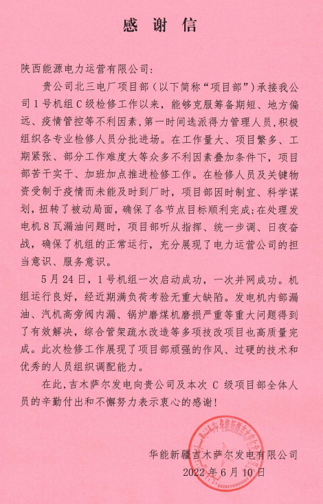 6月21日,吉木萨尔发电发来感谢信,对公司高效优质完成#1机组C修项目表示感谢。