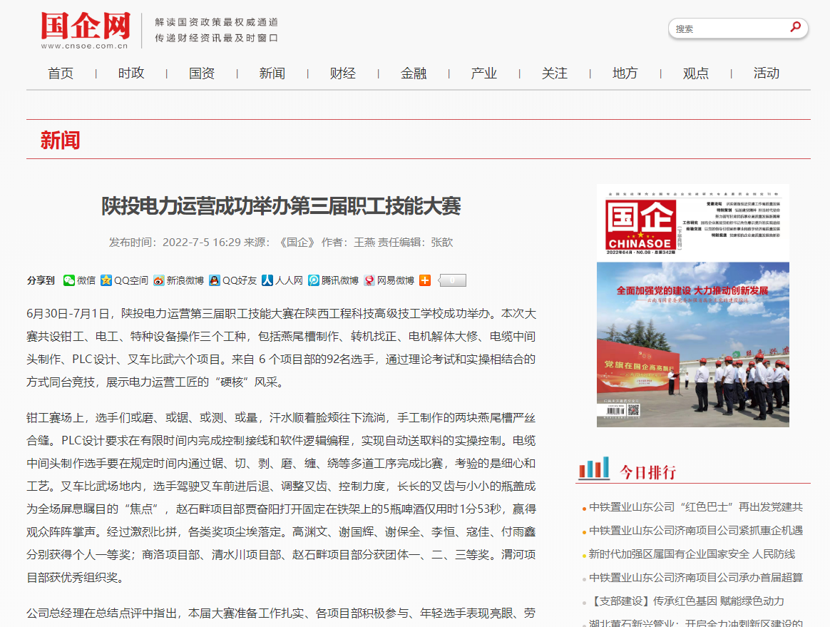 6月30日——7月1日,公司第三届职工技能大赛在陕西工程科技高级技工学校成功举办。集团经营管理部主任梁军军参加闭幕式并为获奖选手颁奖。陕能股份总经济师杨玉林、生产技术部主任王军泓出席开幕式。