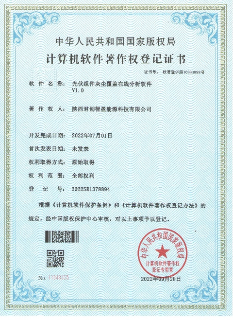 日前,由君创科技牵头研发的“光伏组件灰尘覆盖损耗在线分析系统及自动清洗系统产品”获得国家版权局授权的计算机软件著作权登记证书,填补了公司在新能源智慧化自主研发领域的空白。