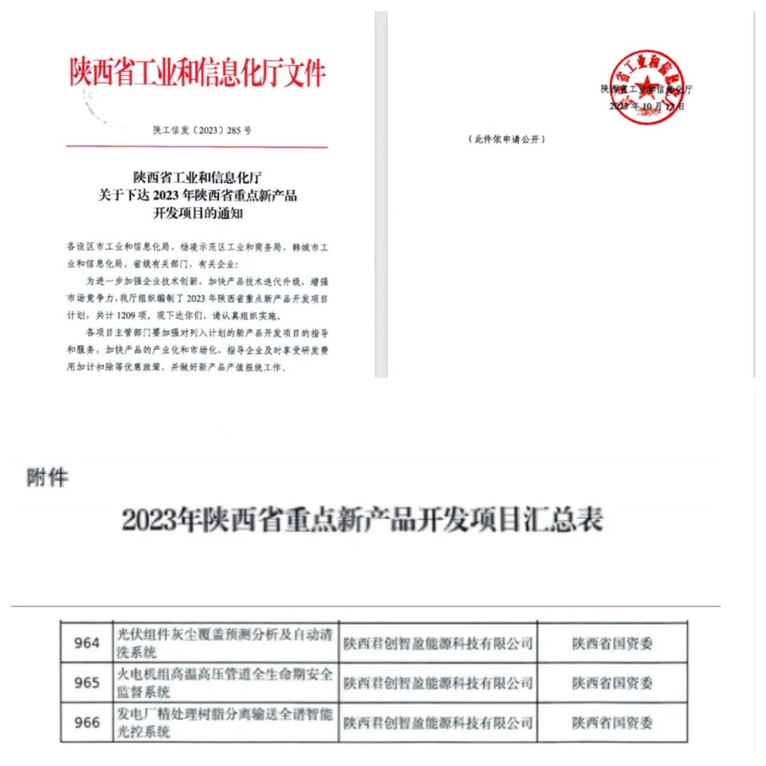 日前,陕西省工信厅发布了《关于下达2023年陕西省重点新产品开发项目的通知》,君创科技光伏组件灰尘覆盖预测分析及自动清洗系统、火电机组高温高压管道全生命期安全监督系统和精处理树脂分离输送全谱智能光控系统等3个项目入选。
