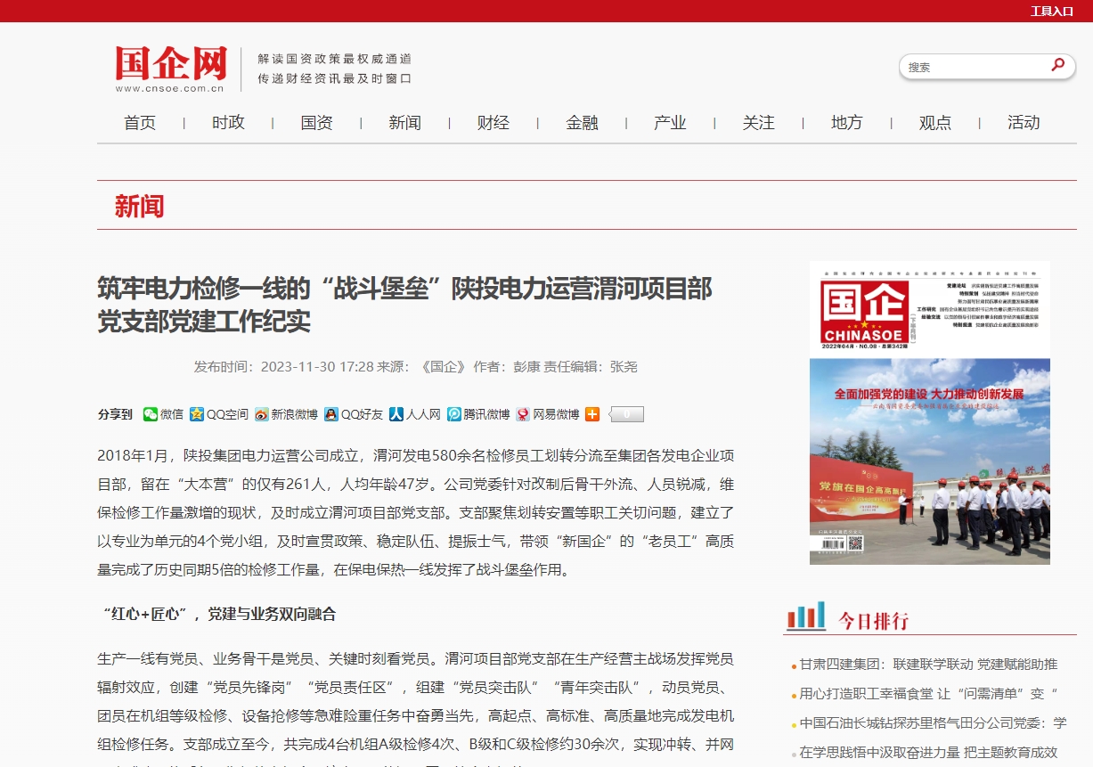 国企网:筑牢电力检修一线的“战斗堡垒”陕投电力运营渭河项目部党支部党建工作纪实