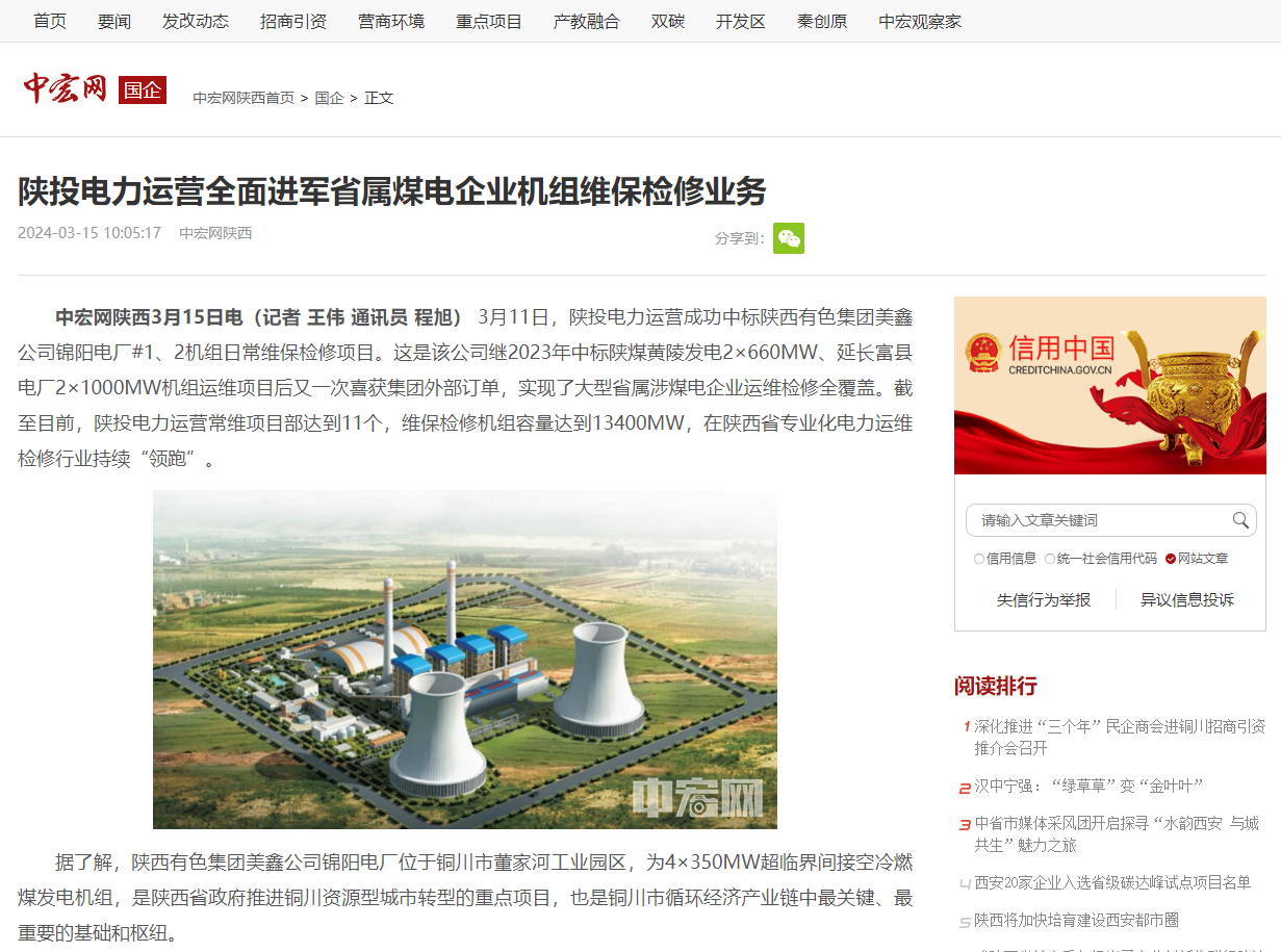 3月11日,公司中标陕西有色集团美鑫公司锦阳电厂#1、2机组日常维保检修项目。这是公司继2023年中标陕煤黄陵发电2×660MW、延长富县电厂2×1000MW机组运维项目后又一次喜获集团外部订单,实现了大型省属涉煤电企业运维检修全覆盖。目前公司常维项目部达到11个,维保检修机组容量达到13400MW,在陕西省专业化电力运维检修行业持续“领跑”。