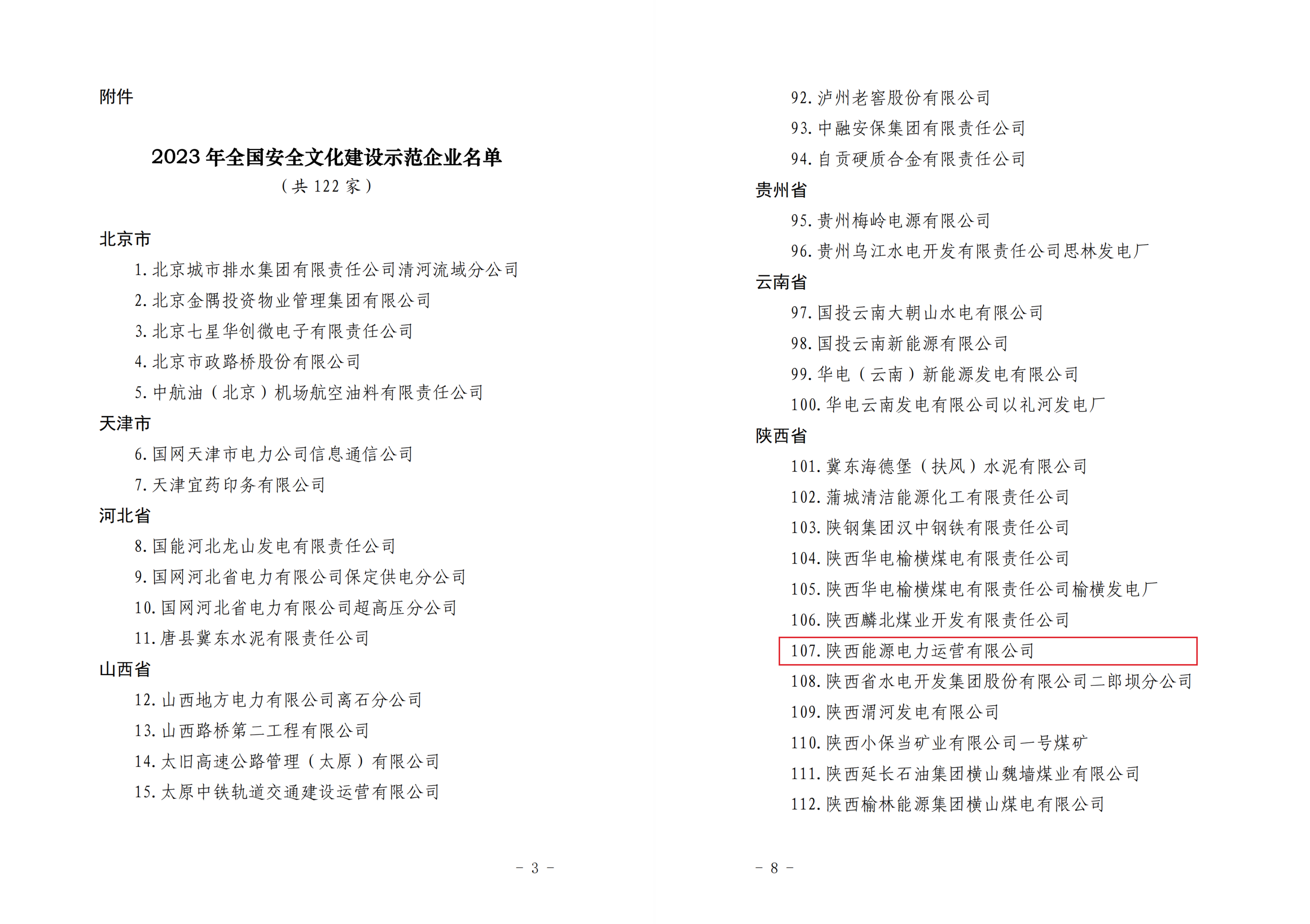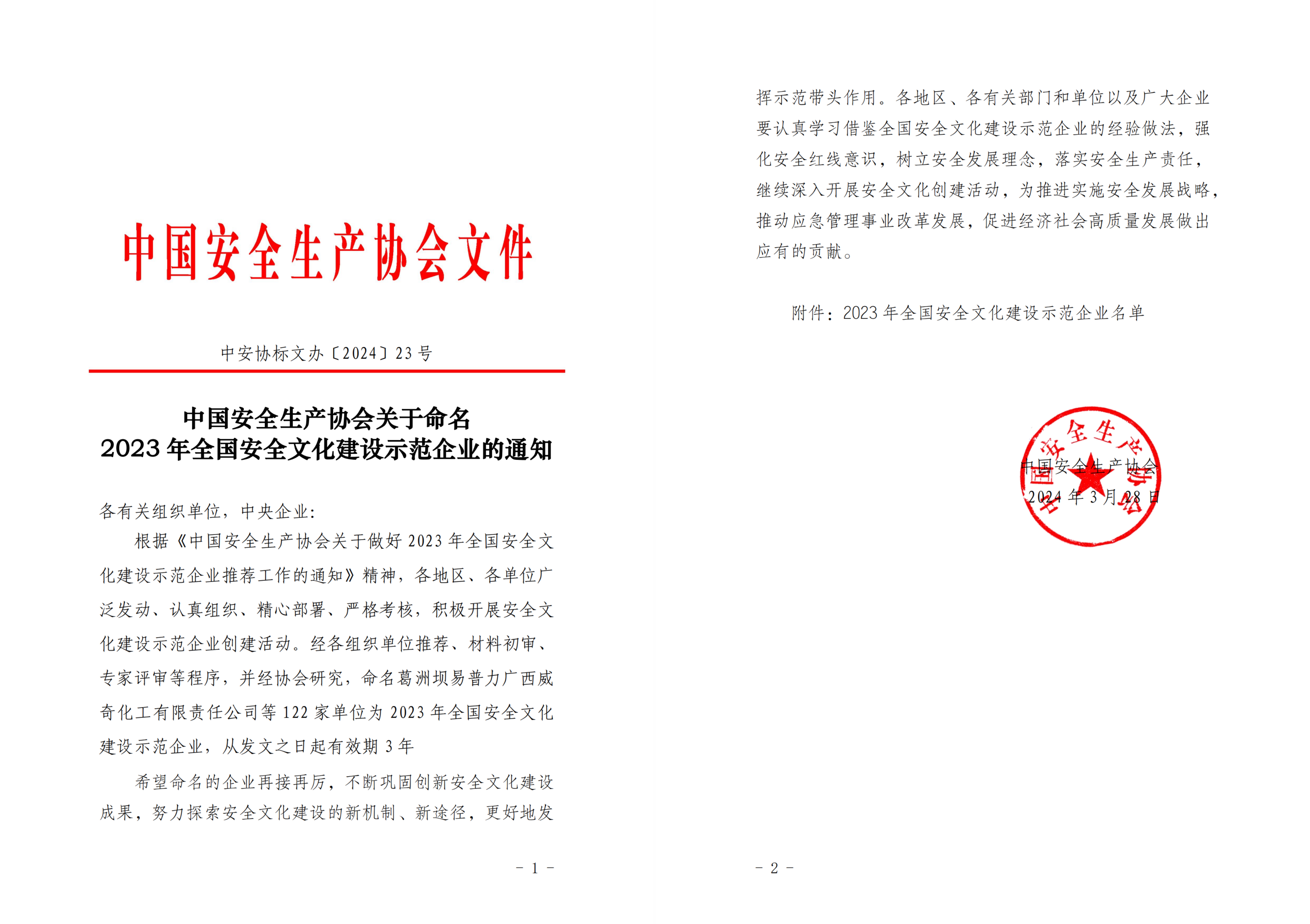 3月28日,公司被中国安全生产协会命名为“2023年全国安全文化建设示范企业”。这是公司继实现安全生产标准化一级达标和取得“省级安全文化建设示范企业”称号后,在安全管理方面取得的又一重要突破,标志着公司培育“想安全、会安全、能安全”本质安全型员工,建立安全文化长效机制取得重大进展。