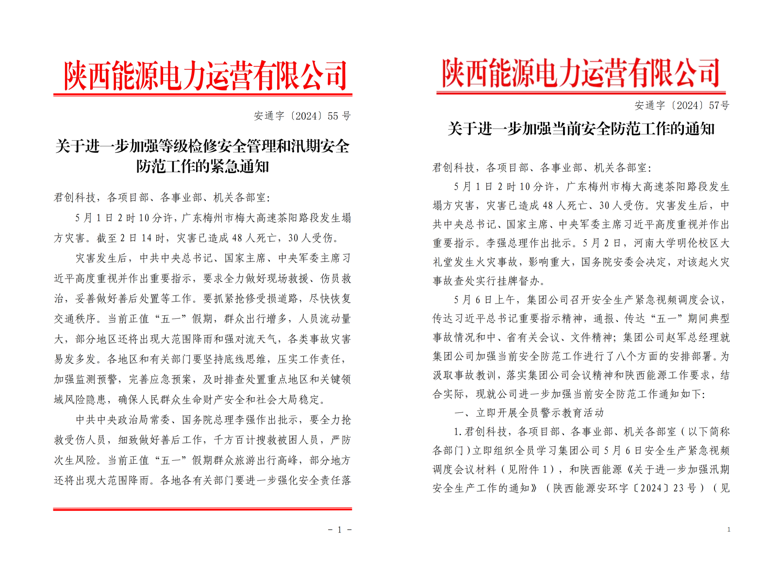 根据陕西能源相关工作要求,公司高度重视,周密安排部署,细化工作措施,于5月3日印发了《关于进一步加强等级检修安全管理和汛期安全防范工作的紧急通知》,扎实开展汛期安全风险隐患排查工作。集团5月6日安全生产紧急视频调度会议召开后,公司立即响应,印发了《关于进一步加强当前安全防范工作的通知》,深刻汲取广东梅大高速塌方灾害及河南大学礼堂火灾事故教训,深入学习习近平总书记重要指示精神,进一步加强安全生产风险防范工作,深化落实防控措施,深化完善防控体系,坚决遏制各类安全生产事故和社会影响事件发生。