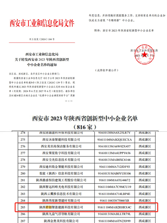 日前,君创科技顺利通过陕西省工业和信息化厅认定,获得“2023年陕西省创新型中小企业”。