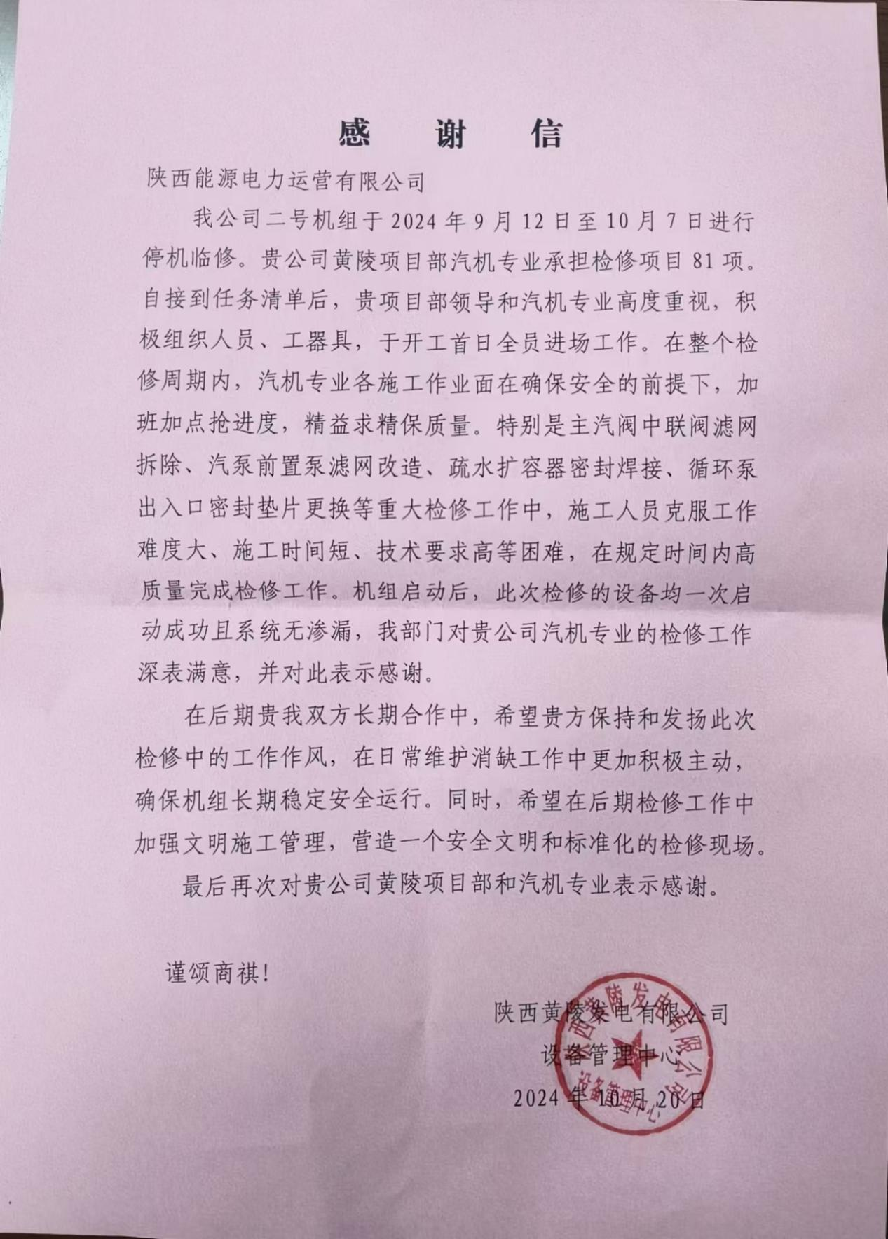 10月20日,黄陵项目部收到业主发来的感谢信,对项目部高质量完成#2机组临修工作给予高度认可。