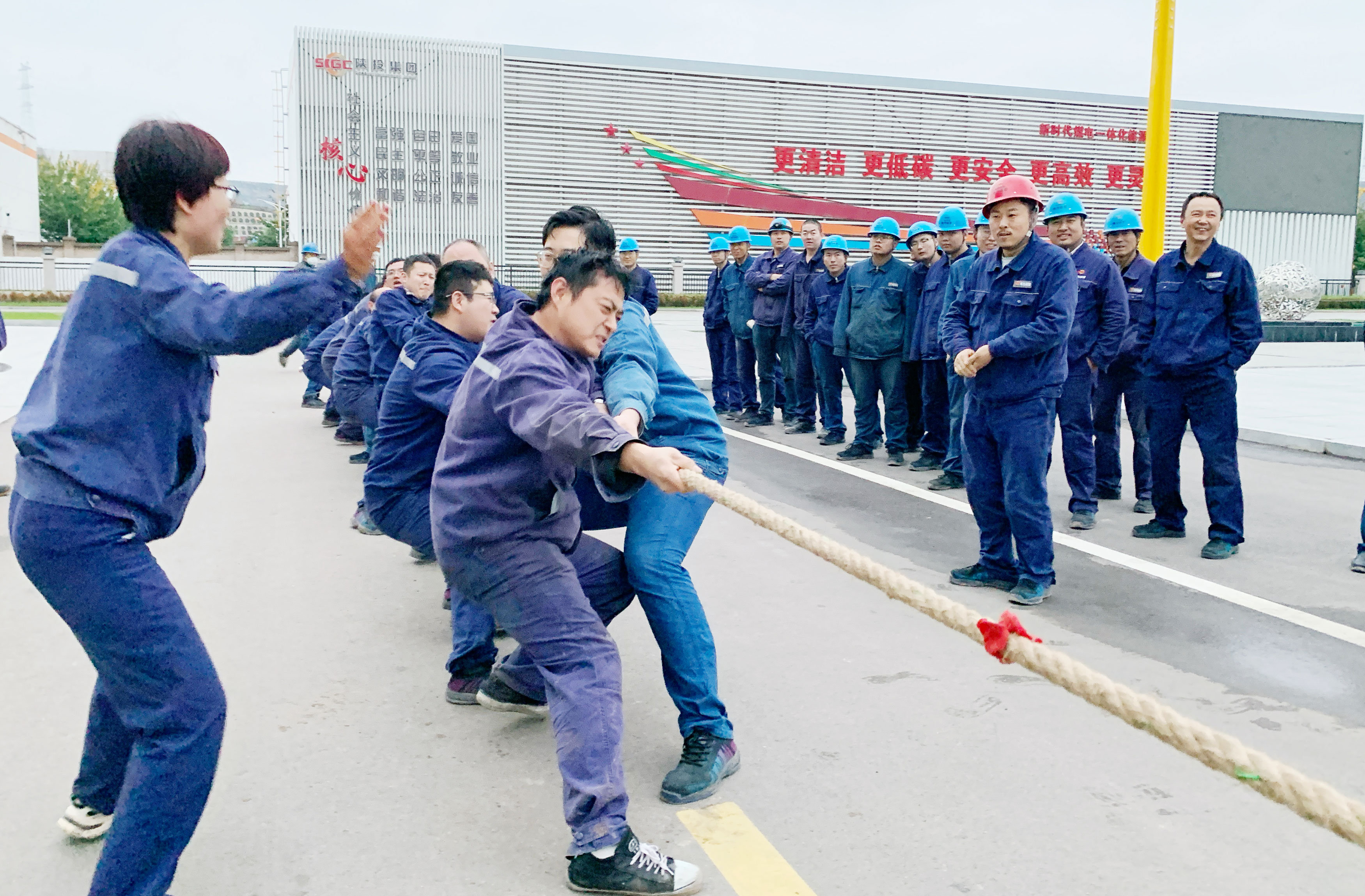 “加油!加油!”一声声助威呐喊之下,拔河比赛有条不紊地进行着,欢呼声、掌声响起,一点点驱散着职工的疲惫与秋雨中的寒意。虽然工作很辛苦,但是各专业队伍依然情绪高涨,各个摩拳擦掌积极商讨对策,都想要在比赛中拔得头筹。