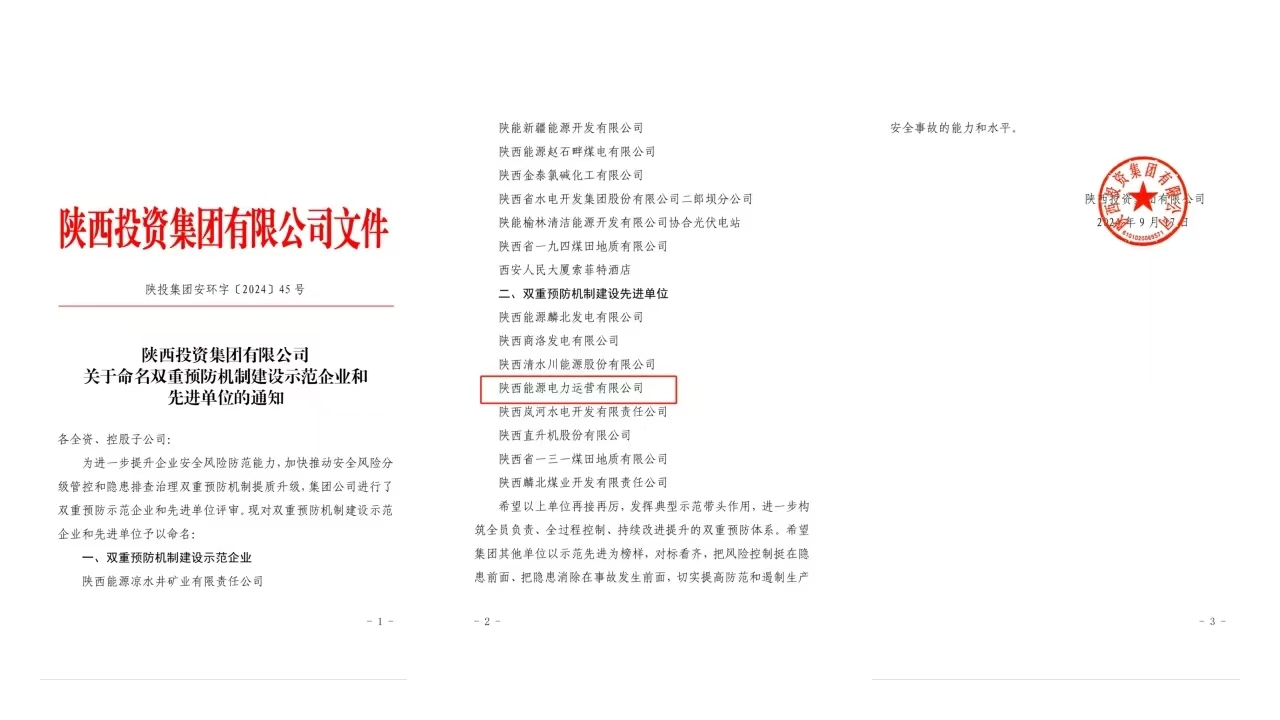 近日,公司荣获陕投集团“双重预防机制建设先进单位”称号。