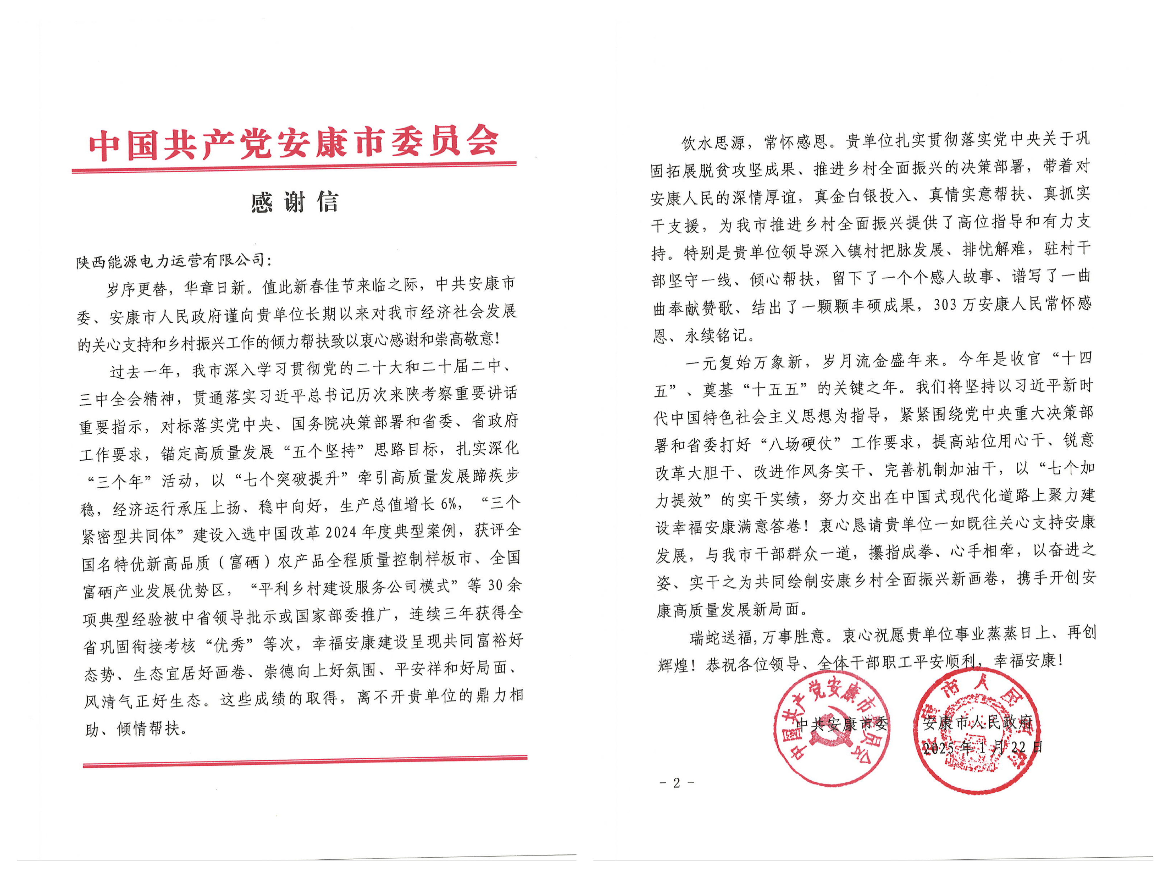 信中表示,电力运营扎实贯彻落实党中央关于巩固拓展脱贫攻坚成果、推进乡村全面振兴的决策部署,带着对安康人民的深情厚谊,真金白银投入、真情实意帮扶、真抓实干支援,为安康市推进乡村全面振兴提供了高位指导和有力支持。希望电力运营一如既往关心支持安康发展,与安康市干部群众一道,共同绘制安康乡村振兴新画卷,携手开创安康高质量发展新局面。