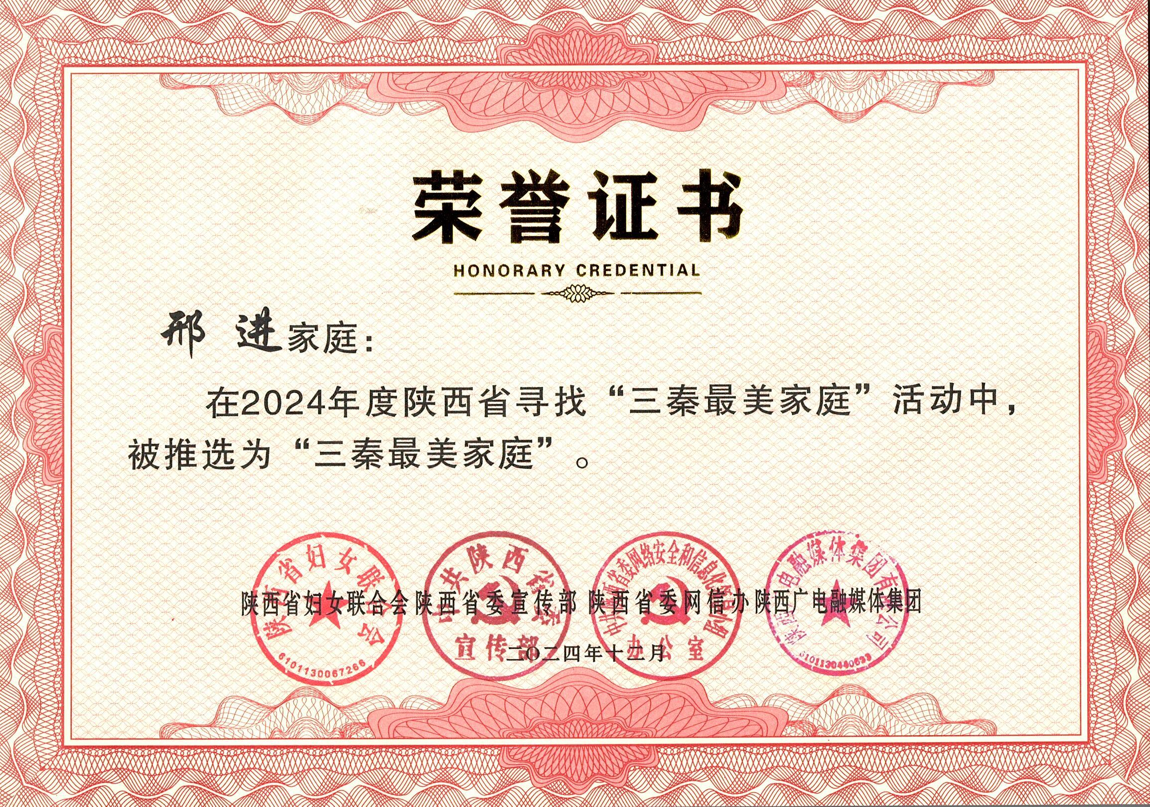 传承好家风 凝聚家力量。“爱岗敬业”的家风深深镌刻在每个家庭成员的心里,邢进在建行西安高新支行工作的妻子多次荣获业务能手,在电信西安北高新分局入职的儿子迅速成为业务骨干。