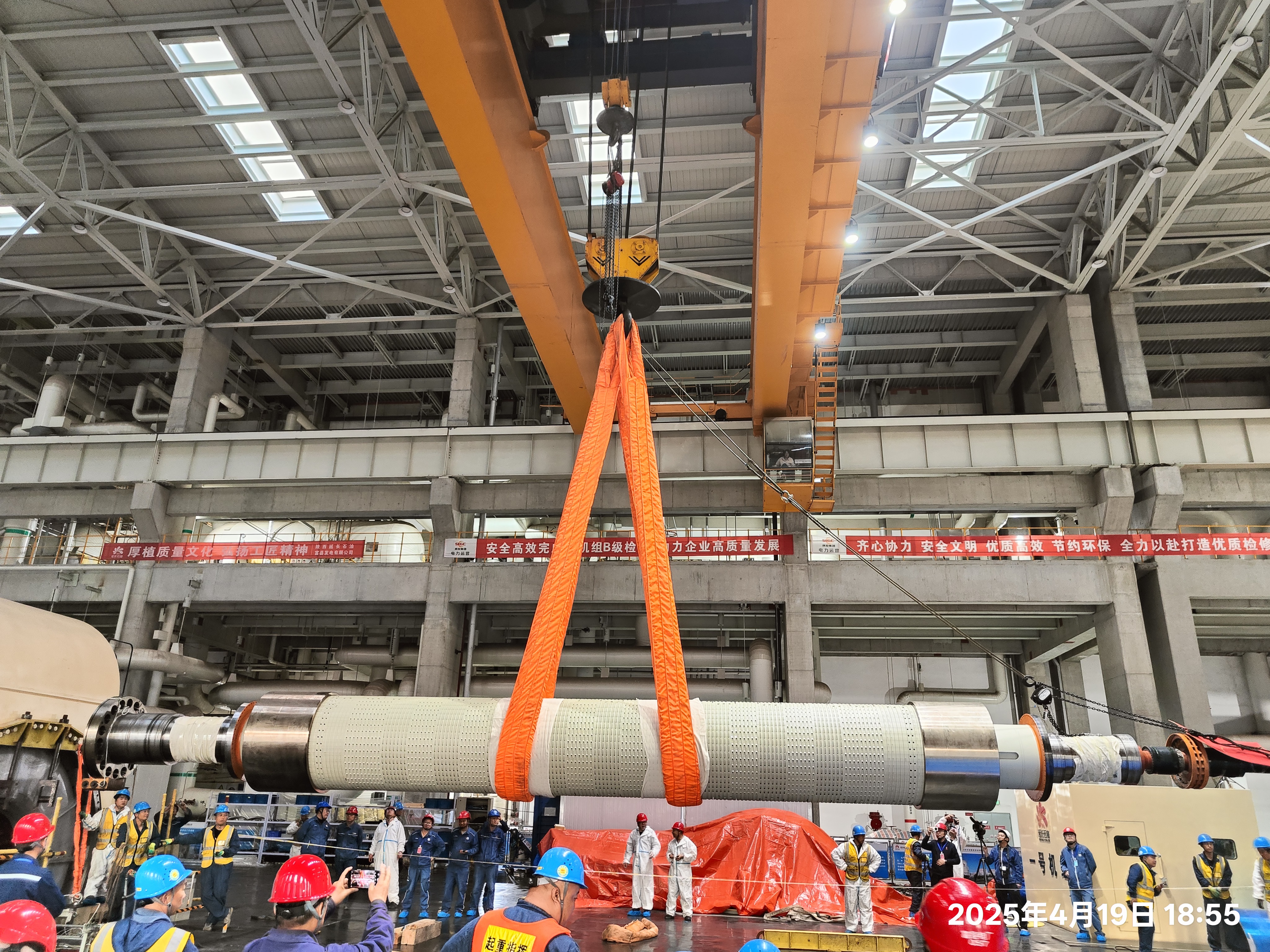 19时15分,暮色渐浓,经过近11个小时连续奋战,重104吨,全长15.7米的发电机转子完美移出定子内膛,平稳落位于专用支架。这一刻,现场响起经久不息的掌声。