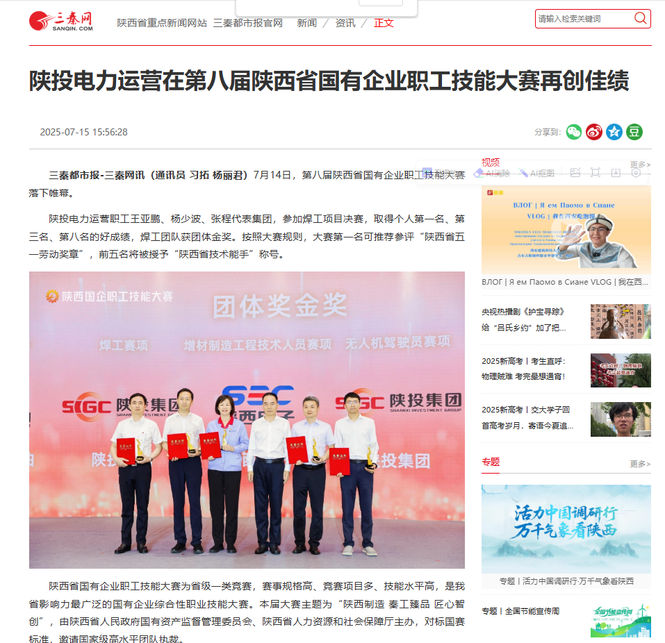 7月14日,第八届陕西省国有企业职工技能大赛落下帷幕。陕投电力运营职工王亚鹏、杨少波、张程代表集团,参加焊工项目决赛,取得个人第一名、第三名、第八名的好成绩,焊工团队获团体金奖。按照大赛规则,大赛第一名可推荐参评“陕西省五一劳动奖章”,前五名将被授予“陕西省技术能手”称号。