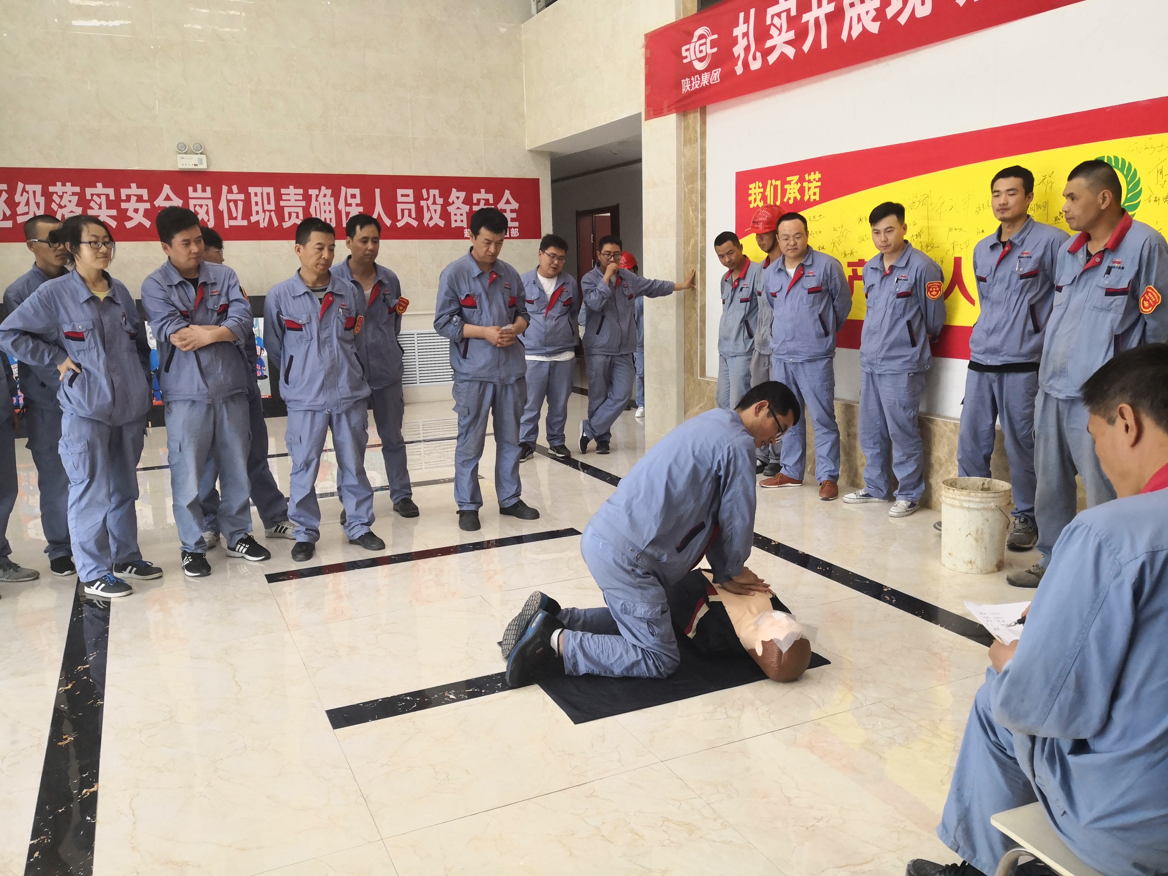 6月2日,进行胸外按压和人工呼吸方法培训;3日,项目部应急组织骨干成员,进行电梯紧急救援实地培训;5日,张贴悬挂自制的宣传横幅和展板,通过形象有趣的图文,宣传安全知识。