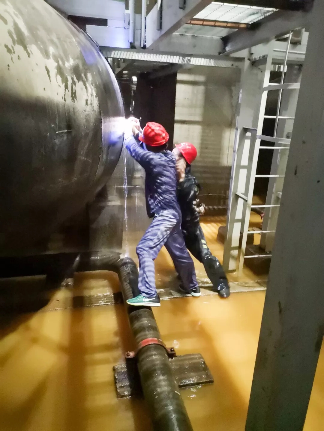 当晚19点20分,#1机凝汽器循环水A侧进水管热工温度计插管突然断裂,大量循环水喷涌而出,危及到#1机组安全运行,情况十分紧急。张兵再次赶赴现场,查明原因后立即组织人员增援,指挥加装潜水泵,防止事态扩大。