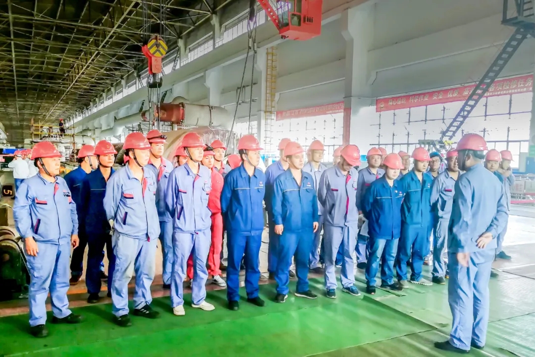 检修现场,在起重人员的指挥下,在两台行车的配合下,转子一寸一寸缓缓向外移动。此刻,从A级检修开始以来,24小时坚守现场的机务队主机班人员正全神贯注,或守在转子两侧精心维护、或钻入发电机内认真观察动静间隙,每一项工作都一丝不苟。