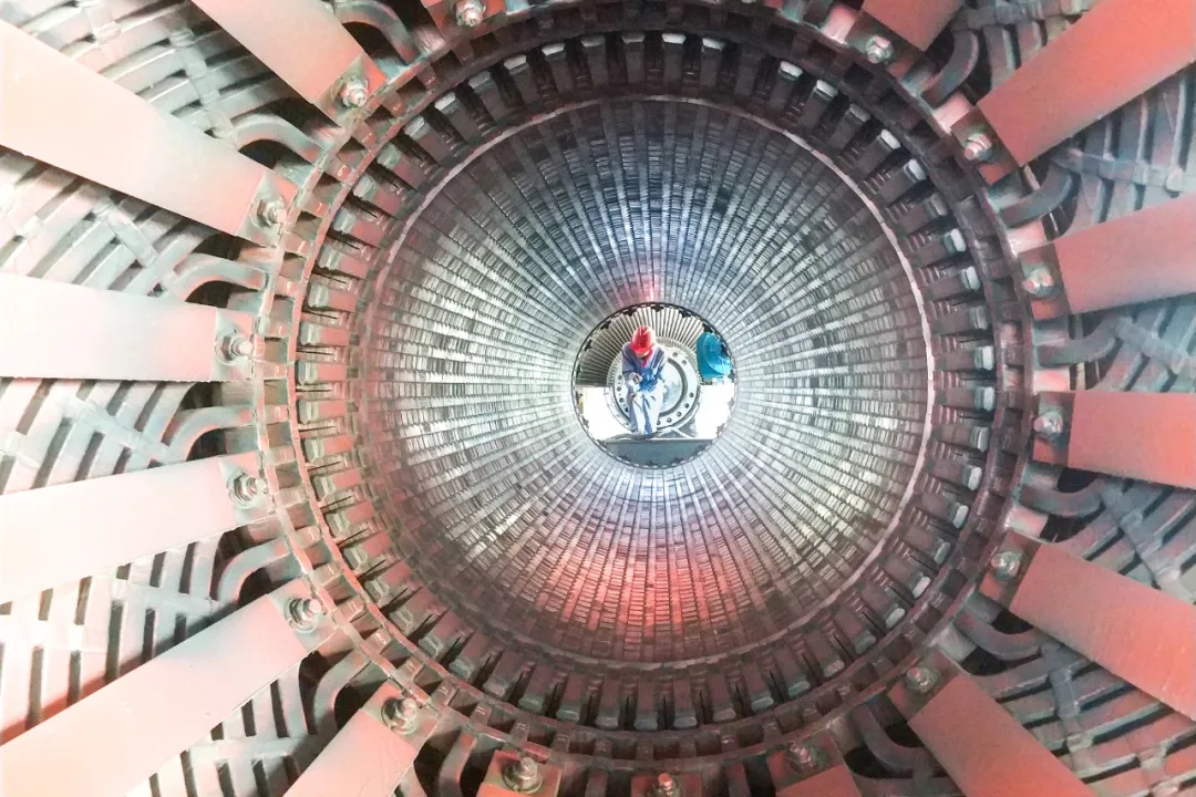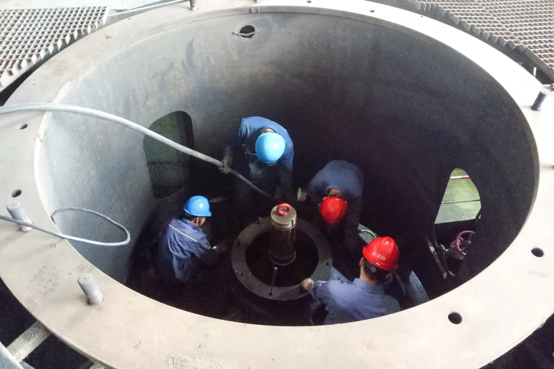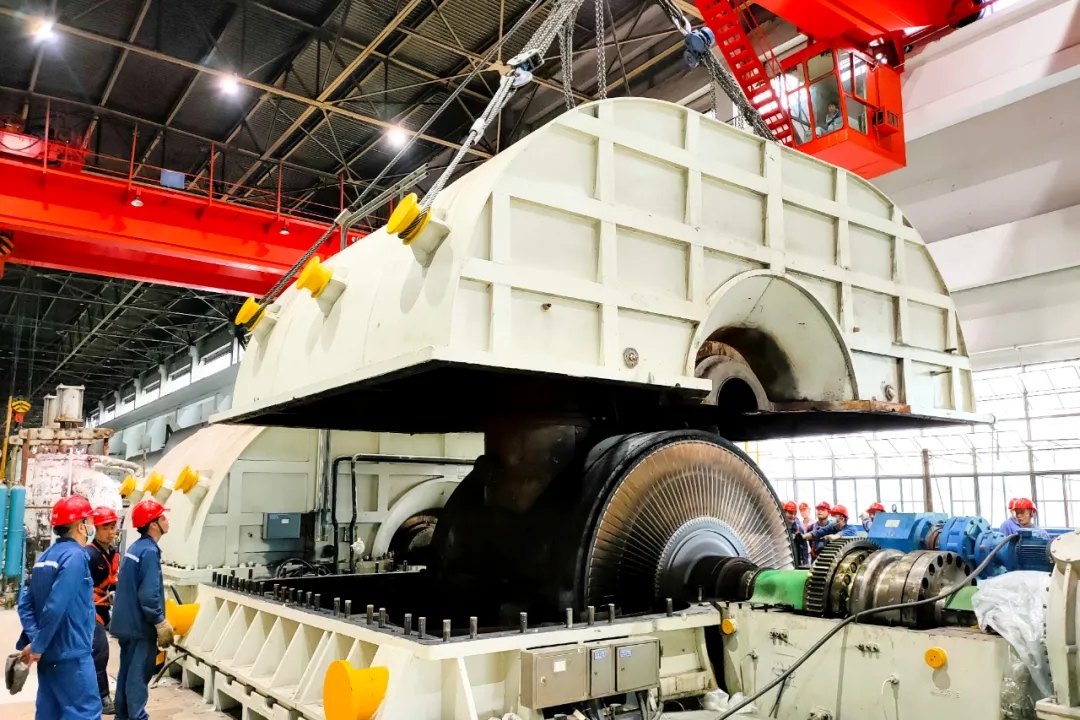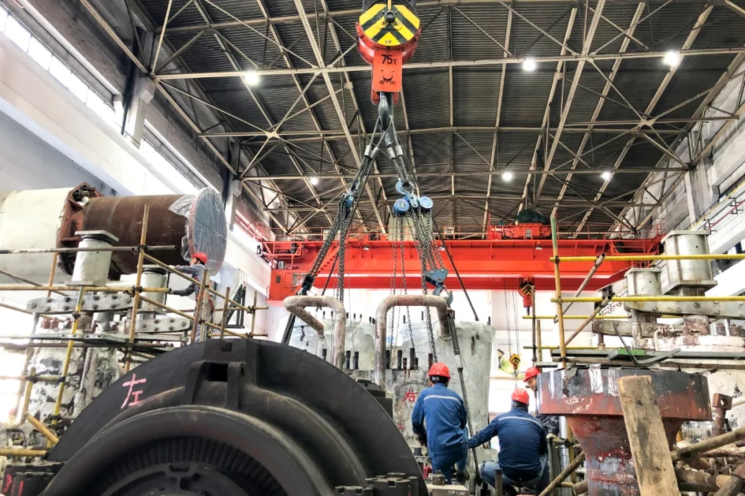 14:10,经过全体人员的连续作业,发电机转子顺利抽出,成功吊至检修区域,为下一步的解体检修赢得了时间。