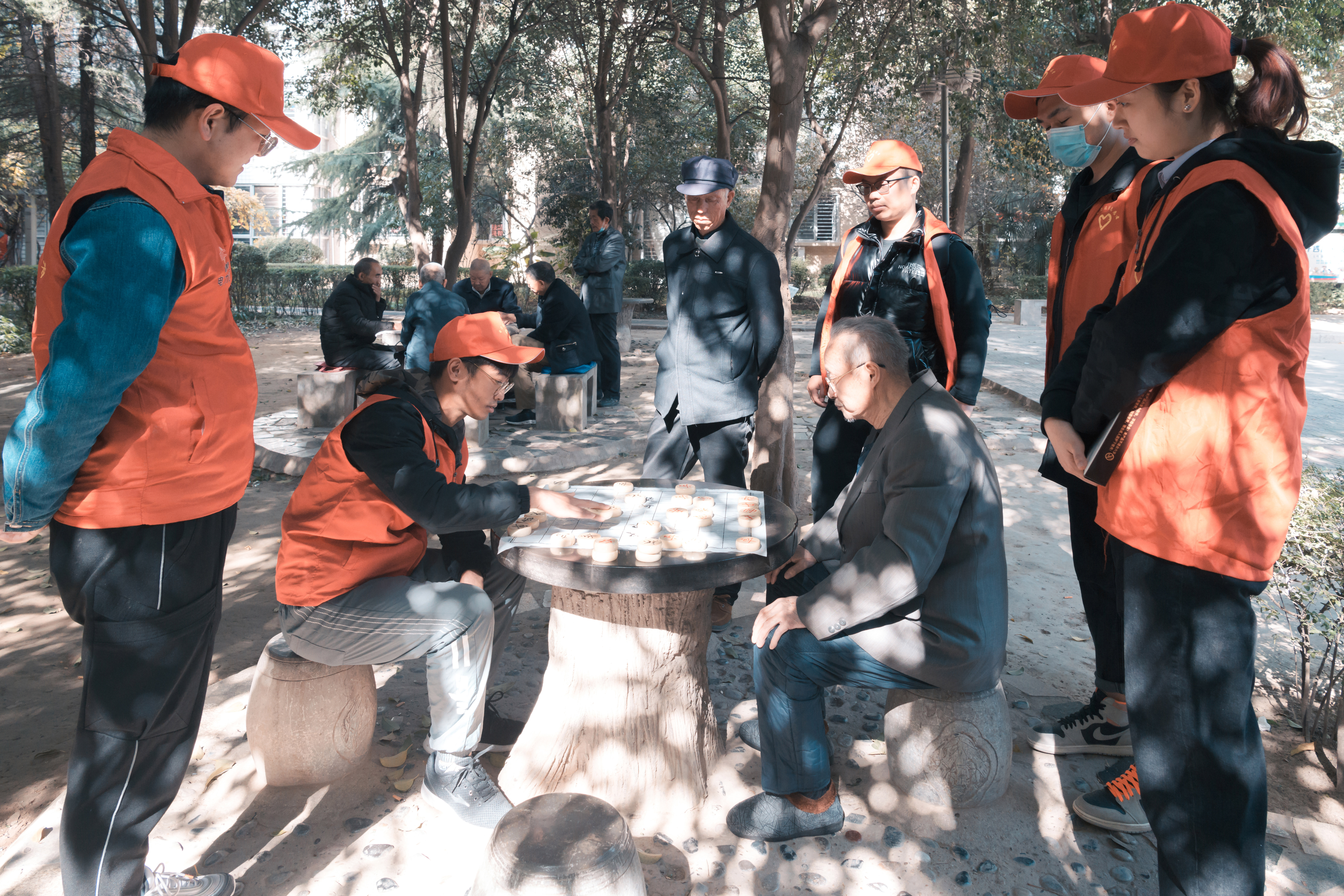 午饭过后,志愿者们带着老人们来到了社区的中心广场。他们有的陪老人散步、闲话家常;有的陪老人摆开棋阵、对阵博弈;有的捶肩搓手、嘘寒问暖;有的大秀才艺,给老人们解闷……志愿者的到来令老人们心情愉悦,他们也纷纷敞开心扉,分享起欢乐的往事,欢声笑语不时回荡在在冬日的暖阳下。