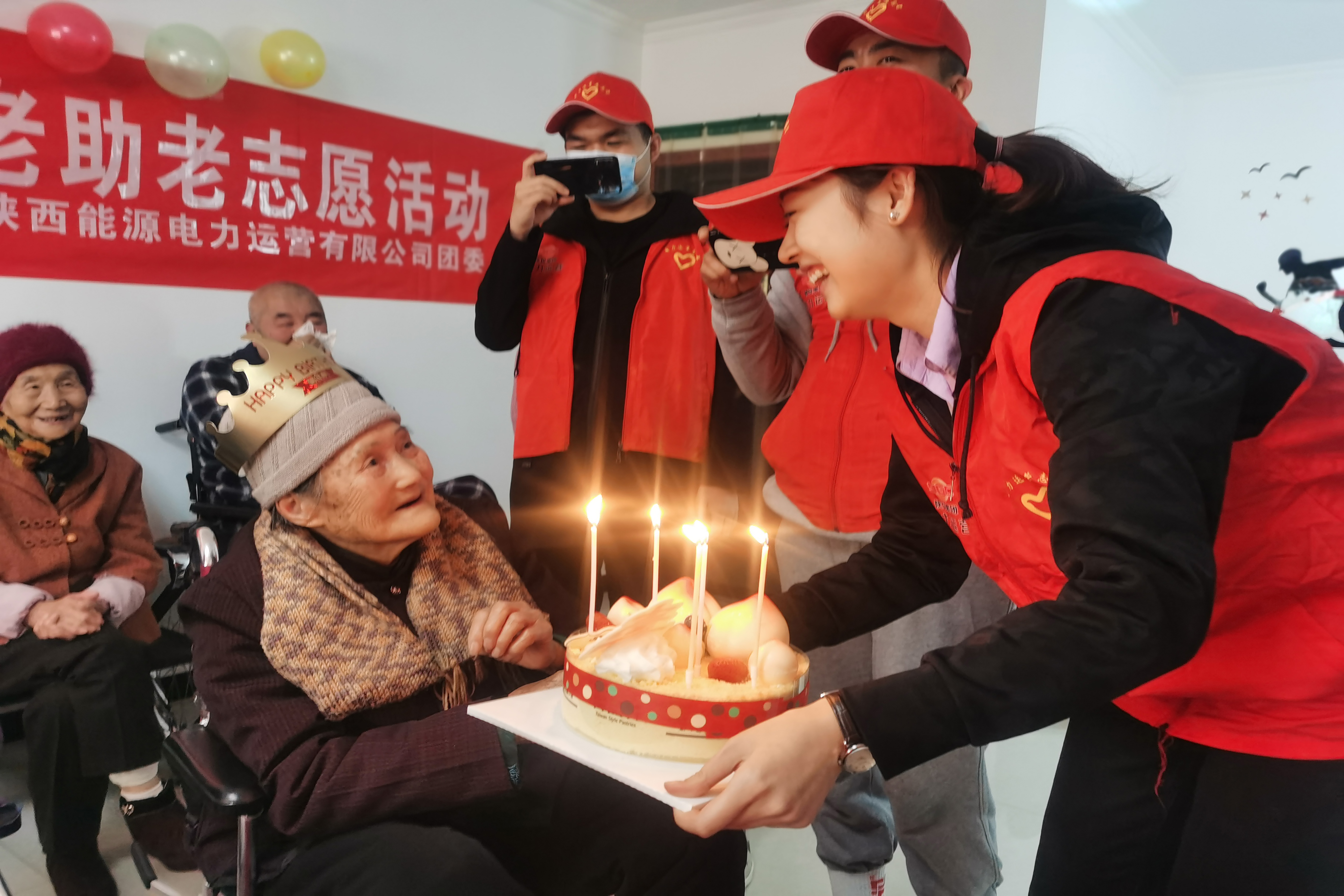 志愿者还为两位过生日的老寿星精心设计了生日会,通过唱生日歌、才艺展示及游戏互动等环节送上生日祝福。两位老寿星在光影闪烁的蛋糕前许下心愿,伴着声声祝福享受着美好时光。