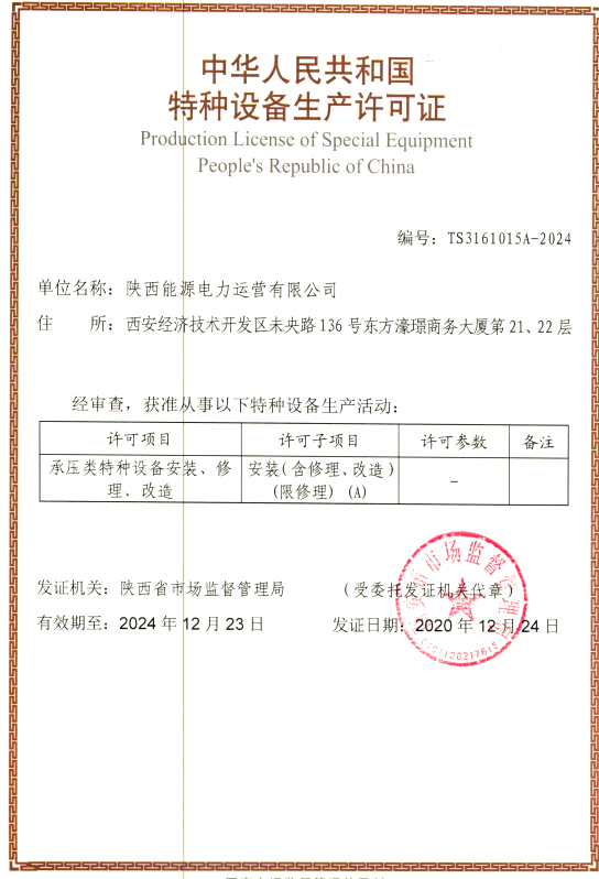 12月25日,从陕西省市场监督管理局传来喜讯,由我公司申请的承压类特种设备安装(限修理)(A)资质成功获批。该资质是目前集团系统电力承压设备检修所取得的最高资质,标志着公司全面具备了参与电力检修市场的资格,必将为企业拓展发展空间、加快市场化改革,打造“能源工匠 品质运营”品牌,提供有力的支撑。
