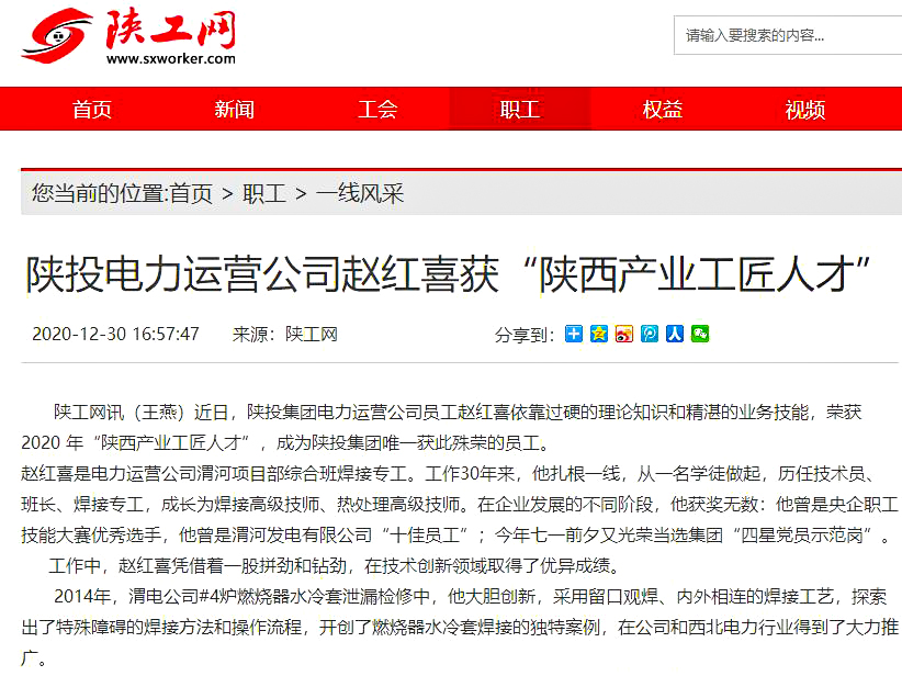 近日,陕投集团电力运营公司员工赵红喜依靠过硬的理论知识和精湛的业务技能,荣获 2020 年“陕西产业工匠人才”,成为陕投集团唯一获此殊荣的员工。