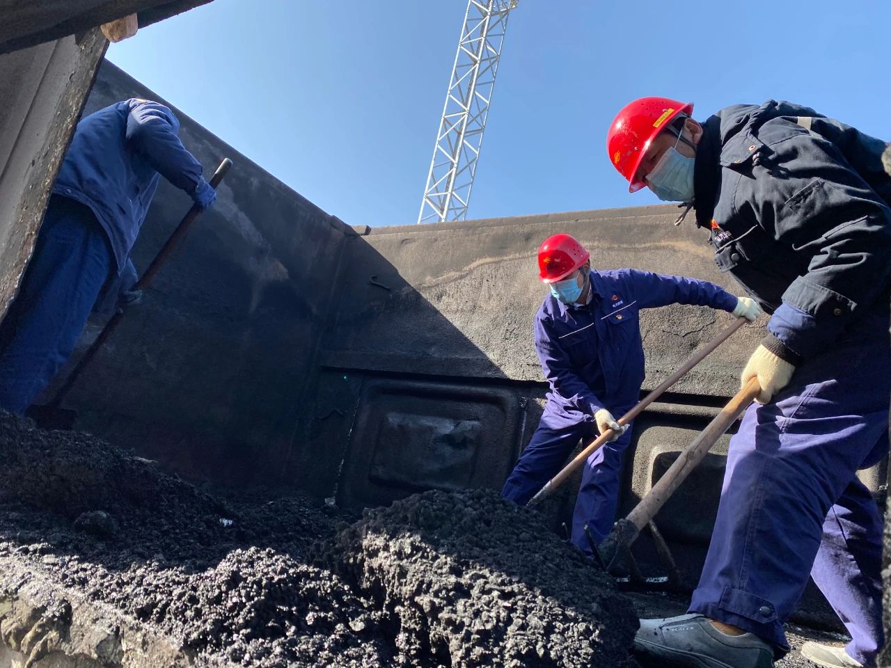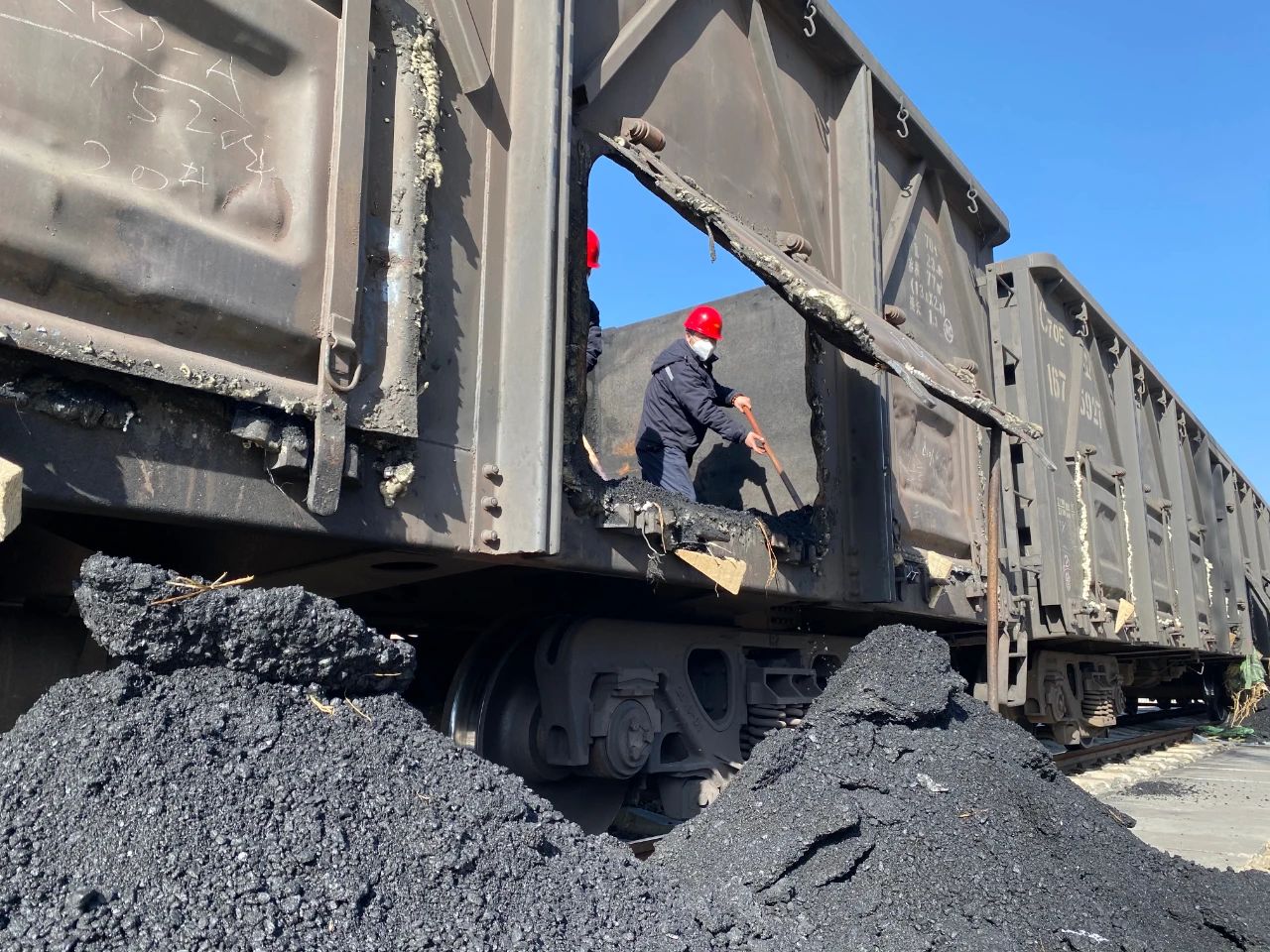 1月12日,商洛项目部从管理干部中紧急抽调18名人员奔赴煤场,对“冻煤”展开人工清理。清理冻煤是一项费劲的体力活,更是一项费时的细活。车厢内,工作人员有序分工,挥动铁镐和铁锹,清理着车厢底部、拐角等处的冻煤。厚厚的冻煤坚硬如铁,工作人员抡圆胳膊,使劲挥动镐头却只“啃”下很小的一块。一镐镐挖,一块块敲,一点点清,清理完一节车厢,汗水早已湿透了棉服,却没有一个人停下手上的活,又马不停蹄转战另一节车厢。